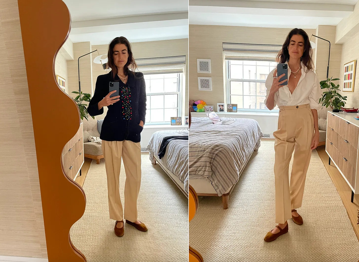 Frank & Eileen button-down shirt, Max Mara pants — taken as one-leg selfie in harsher light so you could see the waist on the pants a bit better