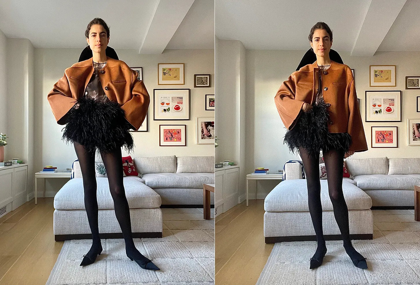 For parties at home, my favorite formula is 2:1 in the favor of the dress code — it’s easy to take a risk within the comfort of my own place, and dressing for parties and being home is an entertaining challenge to rise to. Here’s what I wore last Fri night: