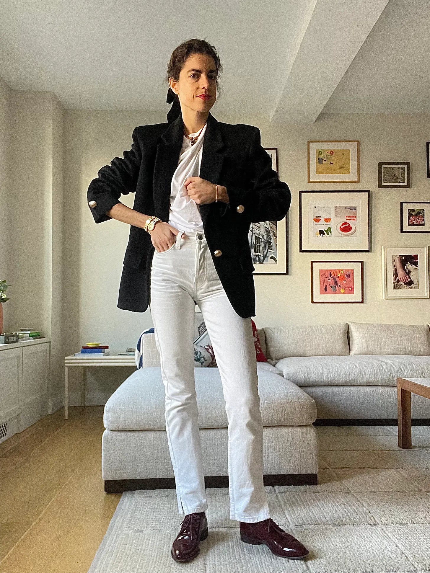 Two parts neutral extremities (white tee, white jeans, and I threw in a summery leather rope necklace too) to one part holiday party season wear (the velvet hair tie). Then the combo of the black blazer with gold button plus shiny burgundy brogues can really go either way (e.g. mean nothing or everything in relation to the dress code) but in the context of this outfit, bc of the bow and the time of year, embody ~tHe SpIrIt.~Vivenne Westwood t-shirt, Re/done jeans (I also LOVE these from Jeanerica), Martin Martin blazer, Old Celine brogues (you can find a bunch on this page; it’s this style).