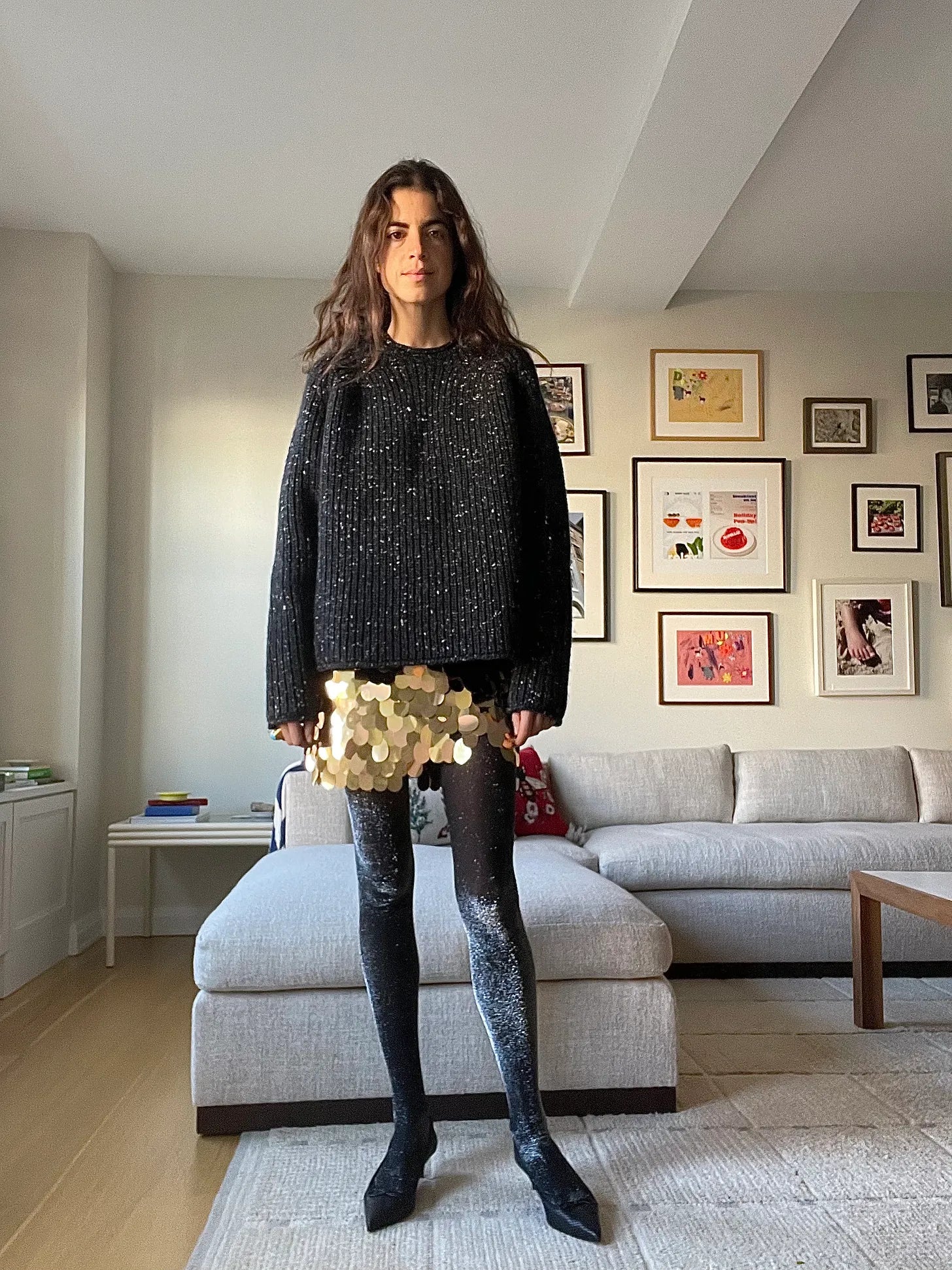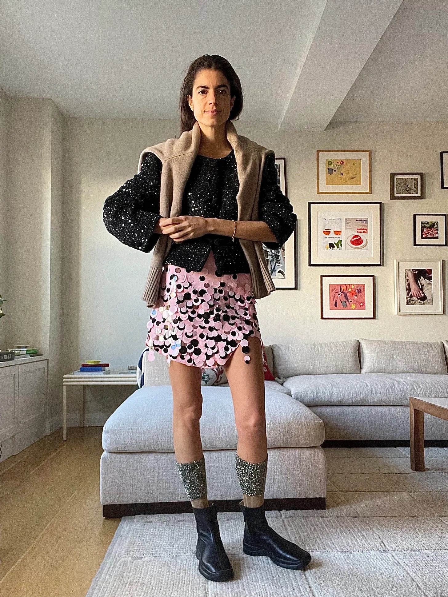 The sausage making: sequined jacket and sequined skirt the base, with the plain sneaker boots and oatmeal colored crewneck sweater around my shoulders as the contrasting “extremities” — the socks don’t have to be shiny but why not? Venstore sweater, New Arrival jacket, Art Dealer skirt, APC x Charlotte Chesnais collaboration socks collaboration socks (the Falke ones are just as good), The Row boots