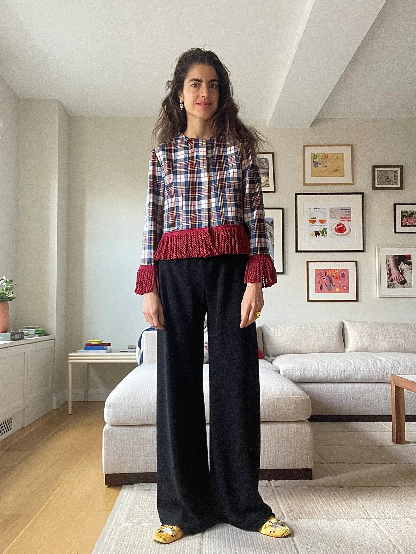 La Veste flannel jacket, The Row pants, Pearl River slippers