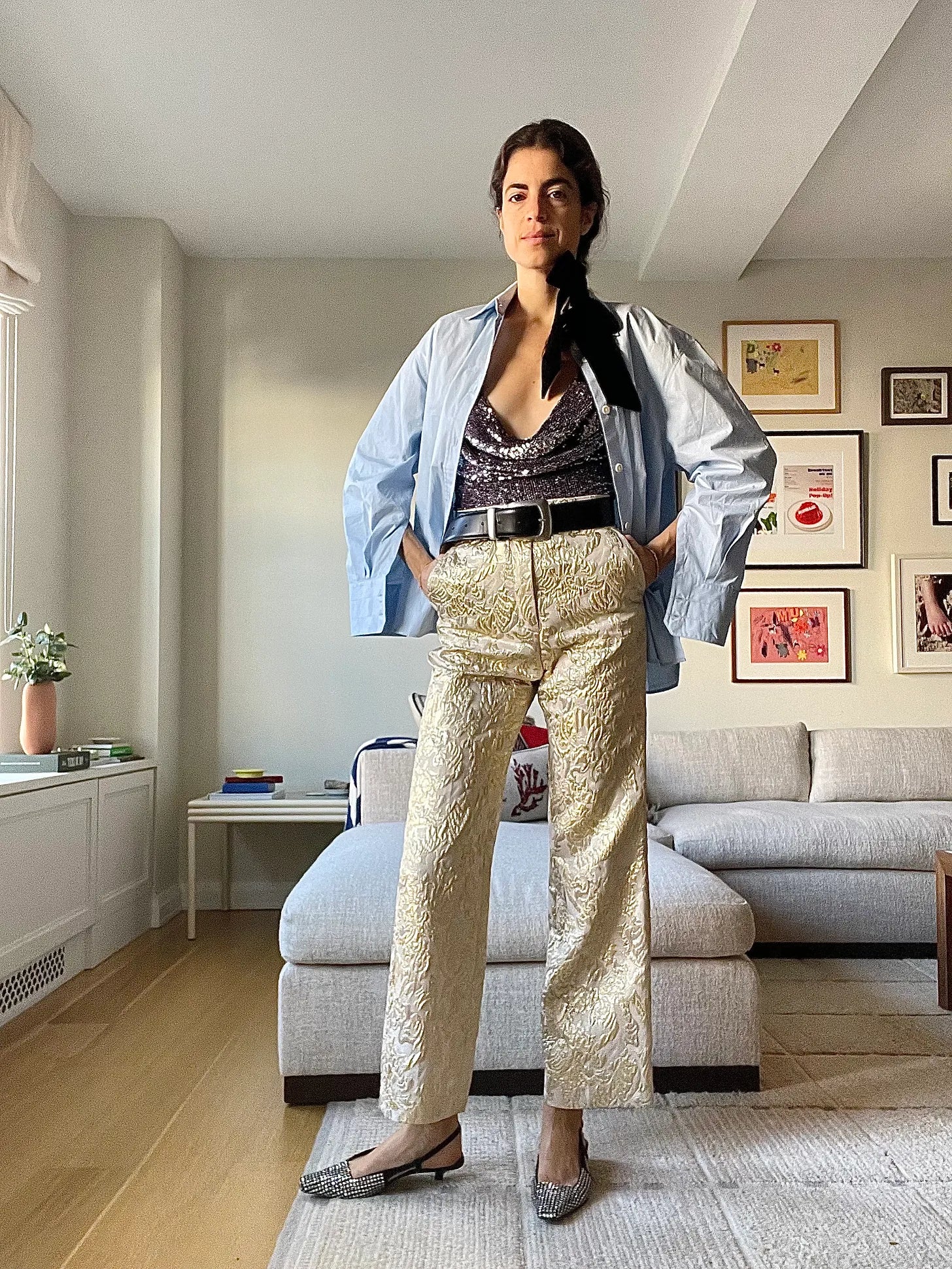 Not exactly festive for the holidays re the colors, but festive nonetheless? This is the kind of thing you might wear in, idk, Miami? Maria McManus blue button-down shirt (here’s a good, more casual comp), New Arrivals sequined top, Paul & Joe pants (La Double J’s cut is good), Khaite belt, Gucci slingbacks
