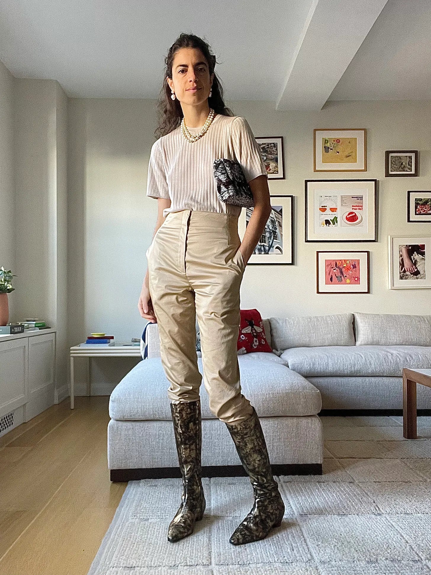 Here’s the reverse! A plain sweater (Venstore) and plain pants (these good khakis! For the fall/winter I suggest a quasi-tapered pair as they pair well with knee-high boots) with holiday season dress code extremities: a velvet bow, tons of pearls, a sequined bag, gold boots