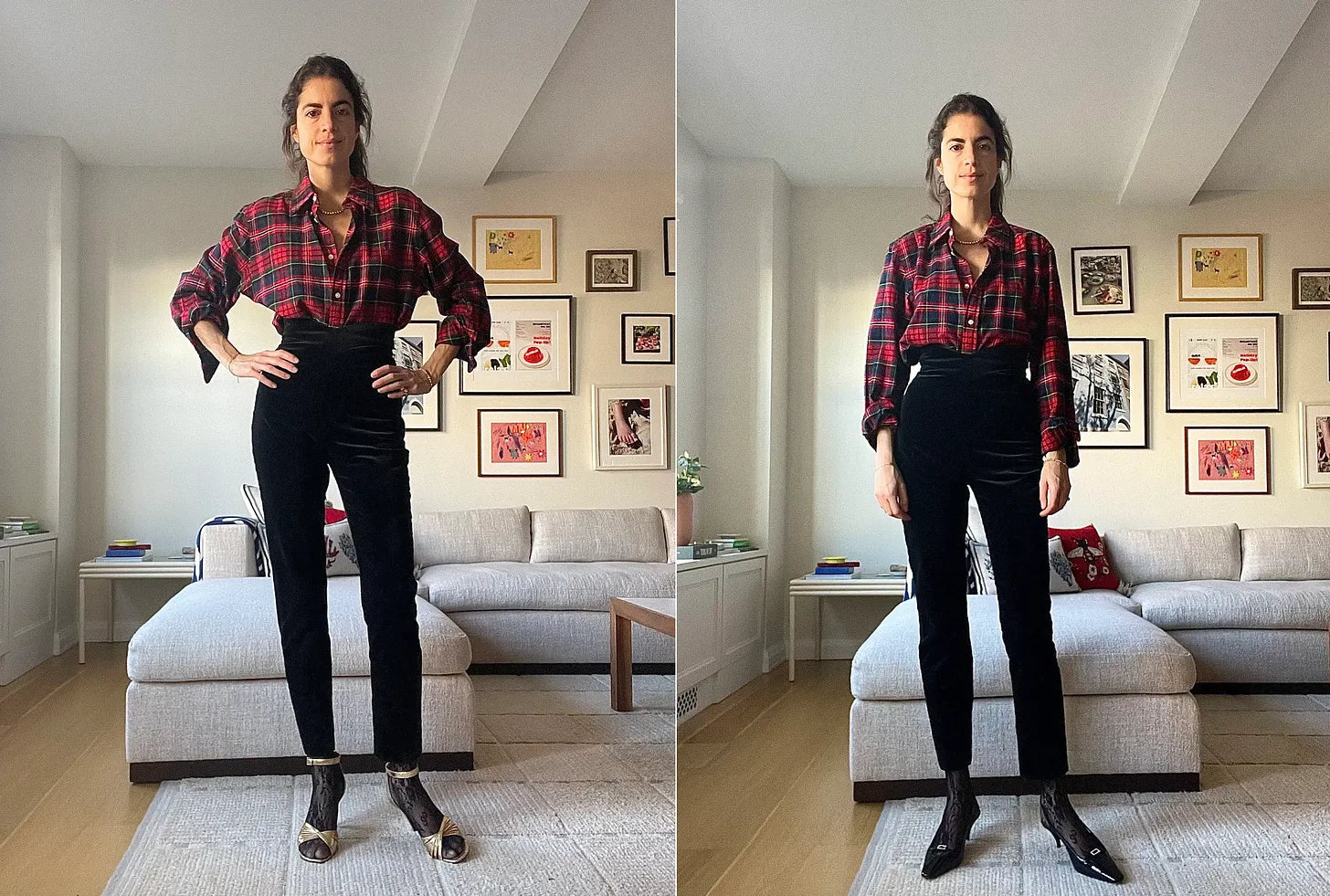 Polo Ralph Lauren mens flannel shirt (here’s one from J. Crew), a similar pair of velvet trousers (also from J. Crew — but tbh, get the Toteme corduroys if you can, Saks Potts tights and two pairs of shoe options — a gold Old Celine sandal (but any skinny heel pair with an ankle strap and relatively narrow toe should do — I love these from Emme Parsons) and Saint Laurent slingbacks, or these are a bit lower in heel height (…and again, these patent leather guys look pretty decent…)