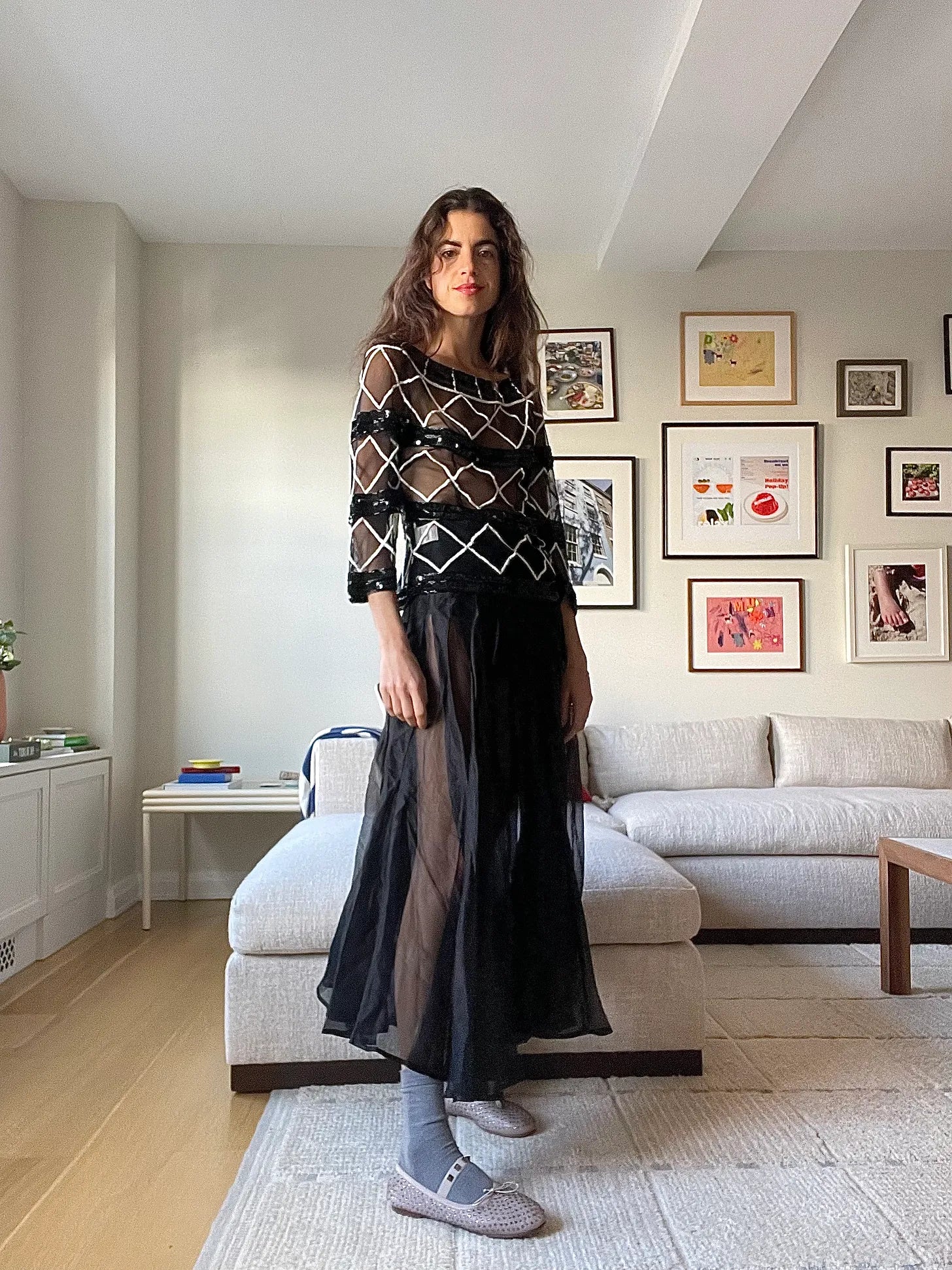 Two parts dress code (sheer sequined top — a different vibe, but I kind of love this one? Would look really cool with a basic turtleneck under, tucked into true blue jeans. The one I’m wearing is a vintage Gianfranco Ferre consignment find, but this one from Junya Watanabe is actually pretty close) to overwhelm 1 part contrast (nude ballet flats with sparkle, grey socks)