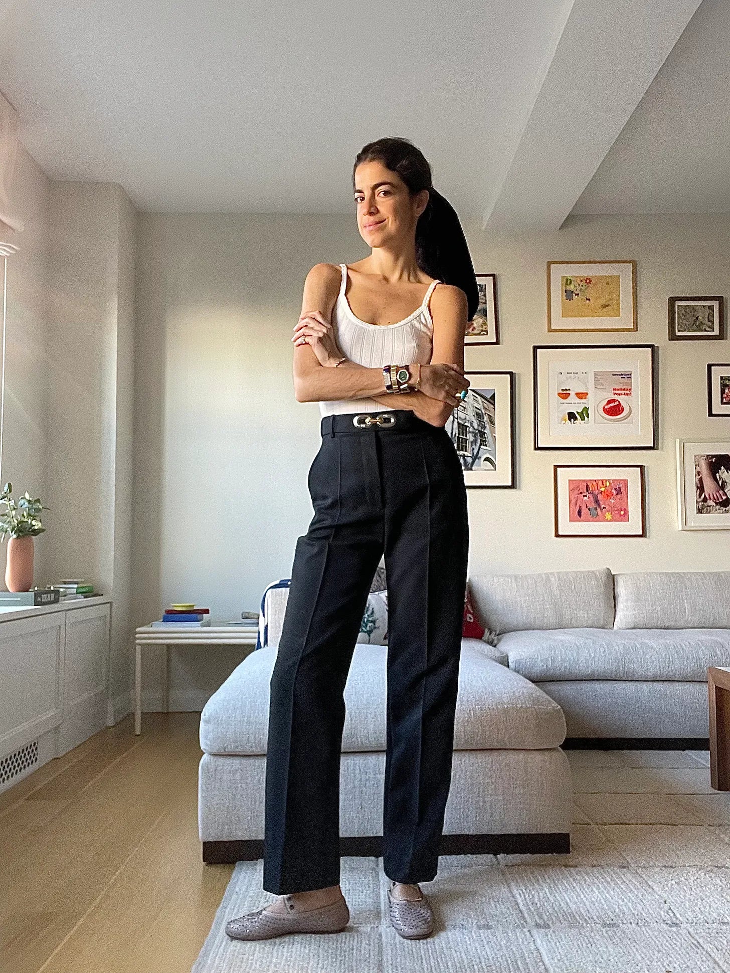Leset tank, LV pants (if you’re looking for good black trousers, I say get these corduroy ones from Toteme), Valentino ballet flats (a v good,v recent Real Real find, but the Loeffler Randalls are good too) and a very big black velvet hairbow from Pardo hats