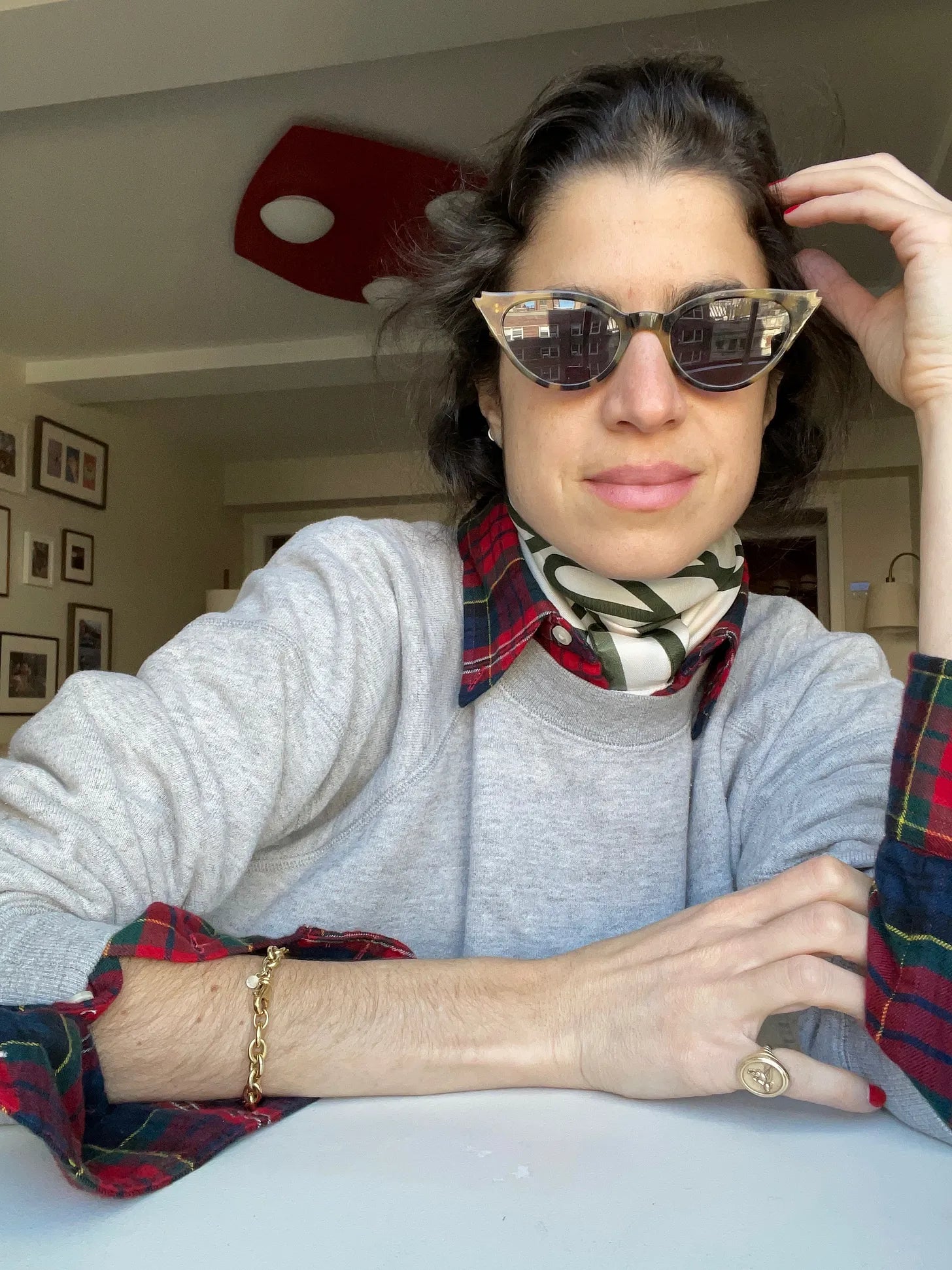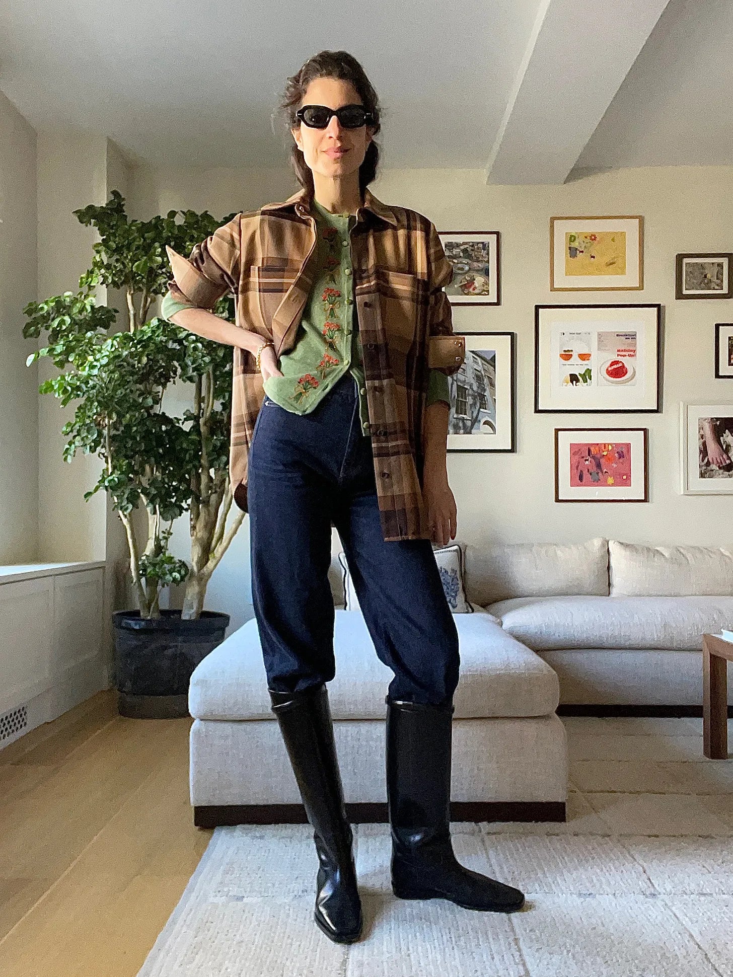 Camilla and Marc flannel shirt (here's one from Madewell for $68, great colors from Polo at $115. This the luxury version at 60% off), Leorosa cardigan (like a more animated version of the 90s Gap icon — here's a cashmere basic from Lands End, a $40 no brainer from J. Crew Factory and one from the aforementioned Gap), Toteme boots, Oliver Peoples x The Row sunglasses