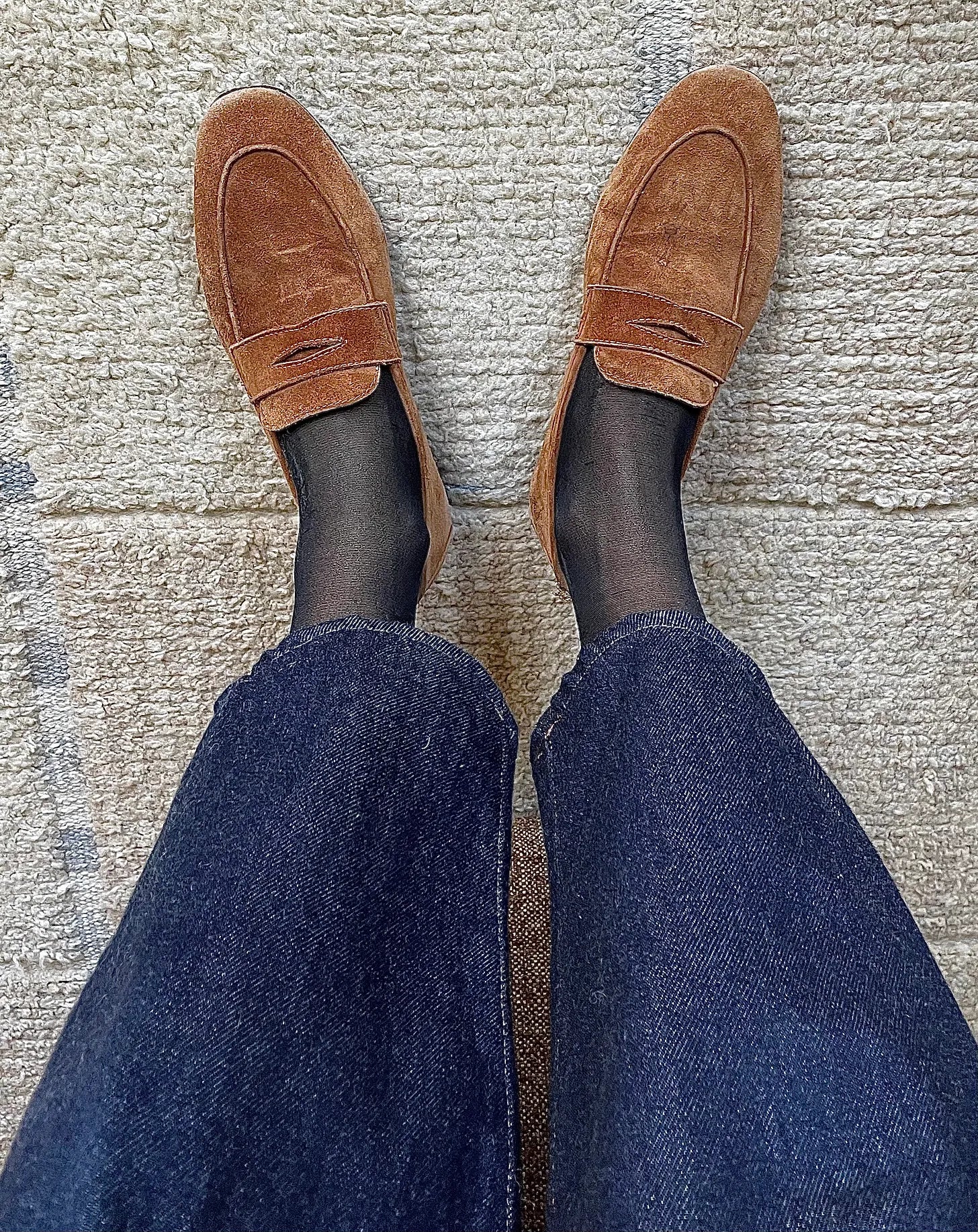 Ok. I get it — so how do I wear them? First, by nailing your shoes. Like that is the main proportion to focus on rn — bottom half of jeans to foot. The shirt doesn’t matter as much because it’s not pulling extra weight anymore. Such good news for your bra, no? Wear a regular crew neck knit with an open hem if you want and leave it untucked. Or tuck in a polo knit. Or button down. Or t-shirt! Any/all are fine.