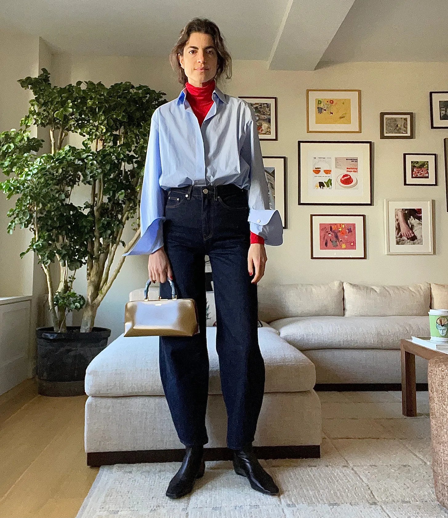 Was clearly inspired by The Row’s most recent lookbook. Lauren Ralph Lauren turtleneck, Salie 66 shirt, Toteme jeans, Jil Sander bag (comes in black too; might be best in blue?) and Toteme boots. These r not the same, but they're good.