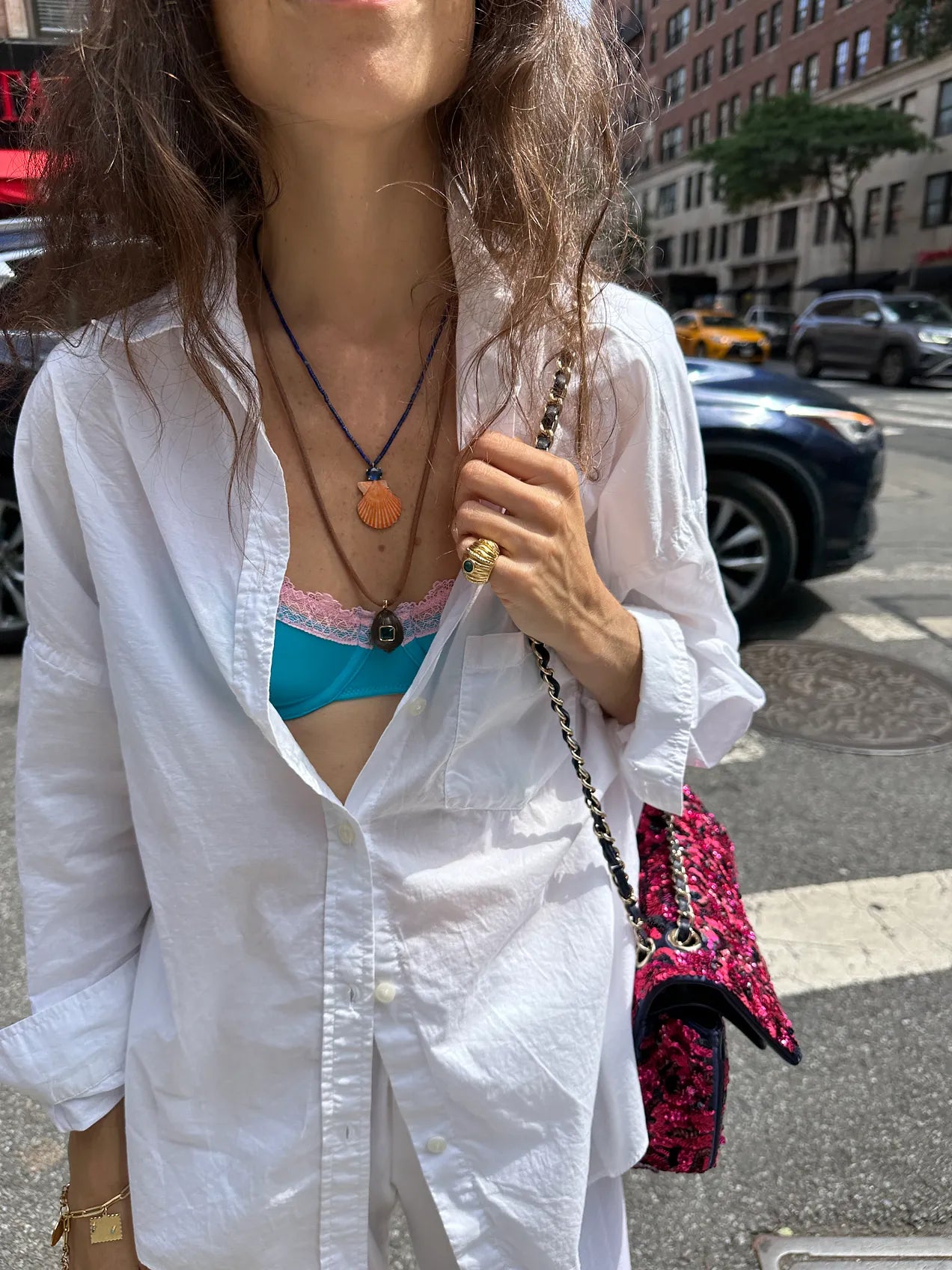 Here, for example, is real footage from my walk to the subway station to get to Sky Ting for a yoga class last Thursday. It marked the third time that week I had worn this outfit, but was the first time I’d styled it with the turquoise silk bra (love this one too), which prior to this day, I had been wearing exclusively with its (the bra’s) matching bottom and a nightgown or sheer beach dress (to freak out my neighbors). My comments on how this works and why it works here are threefold and actually tie back to the tips above.