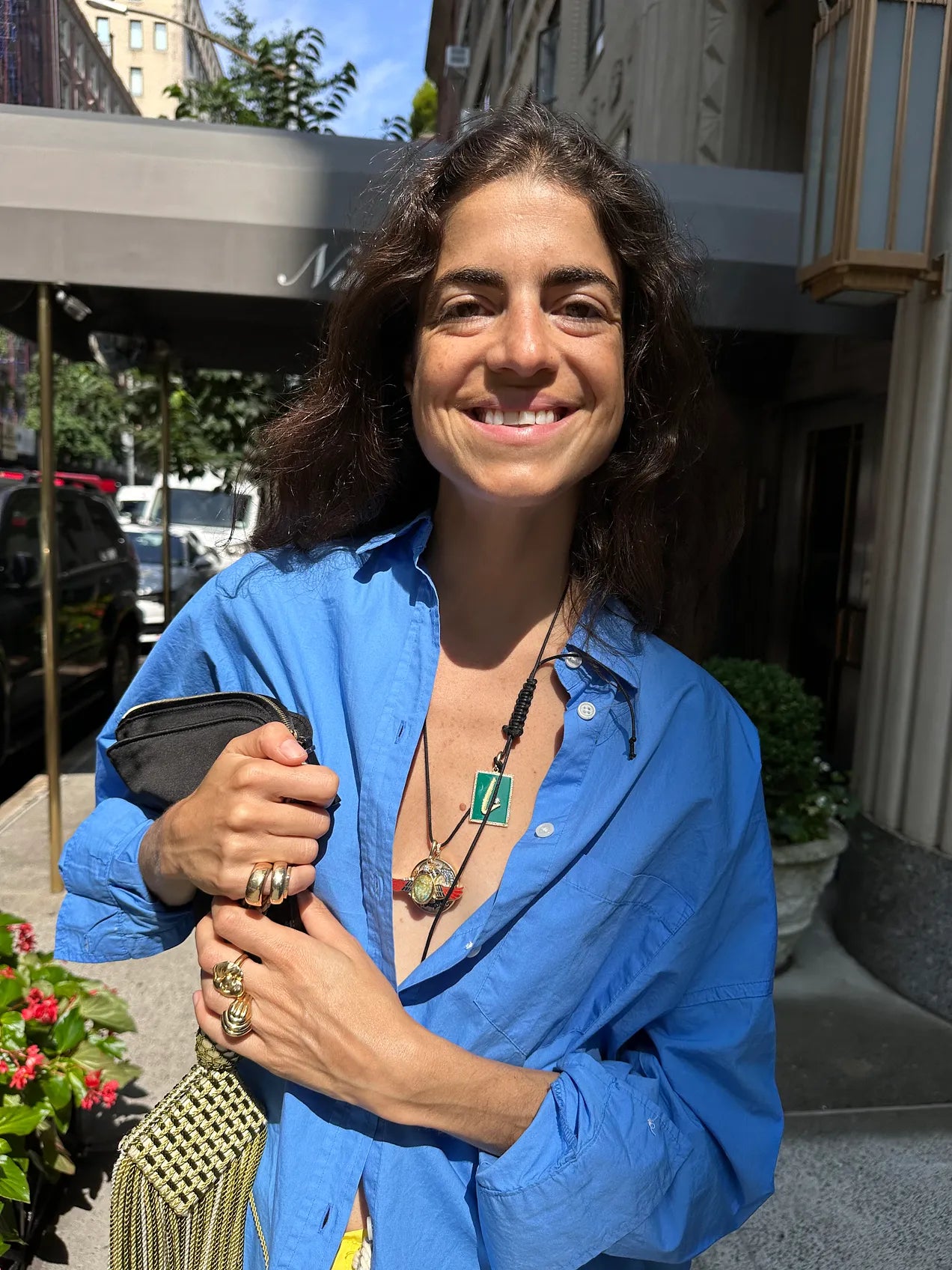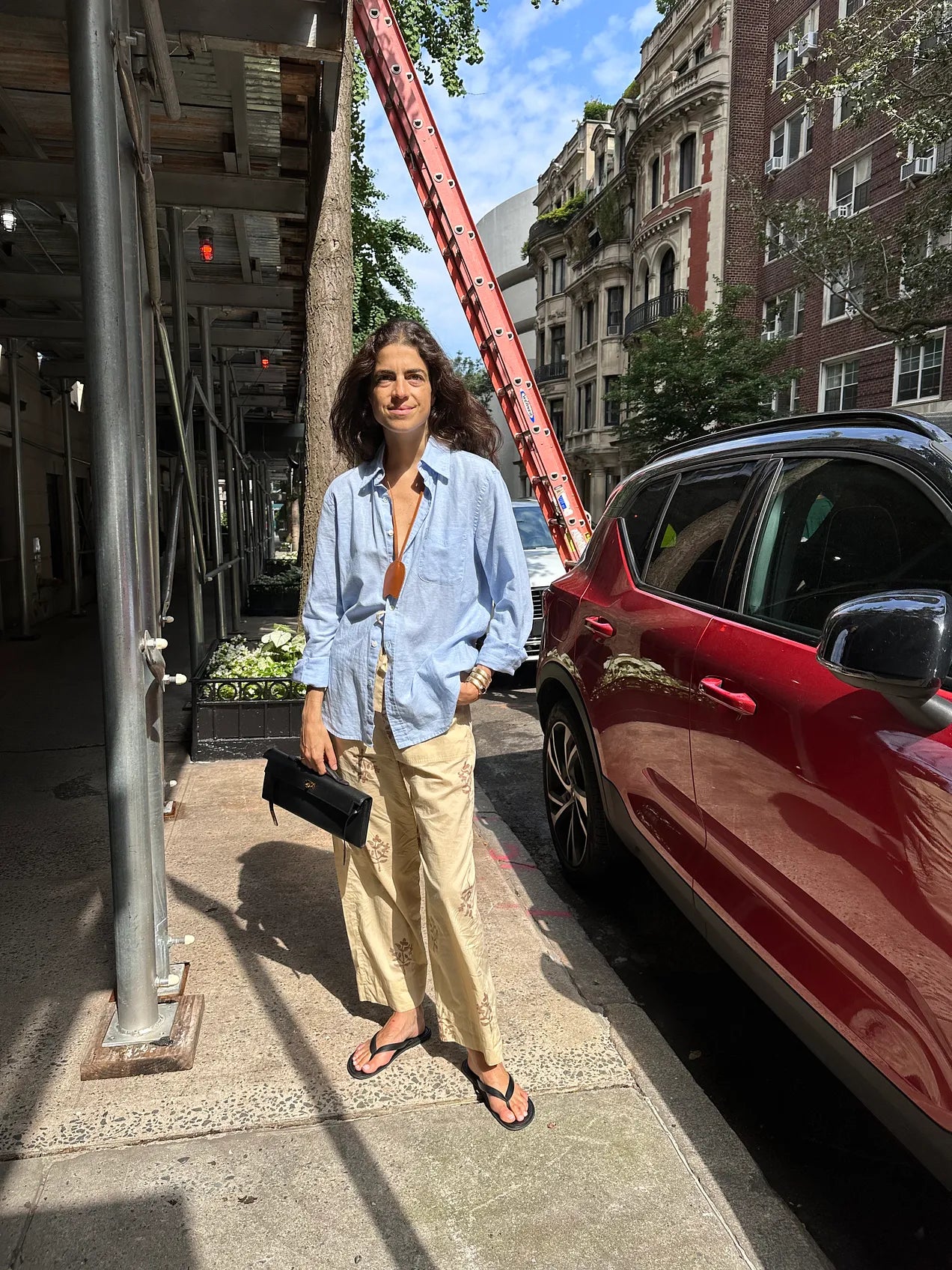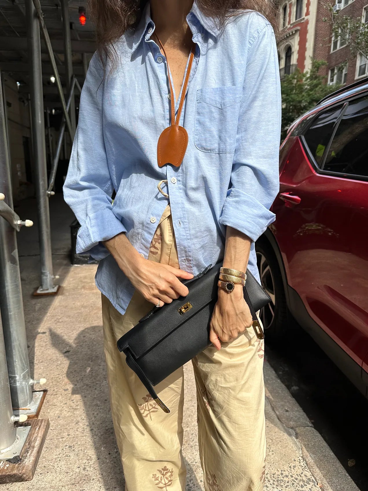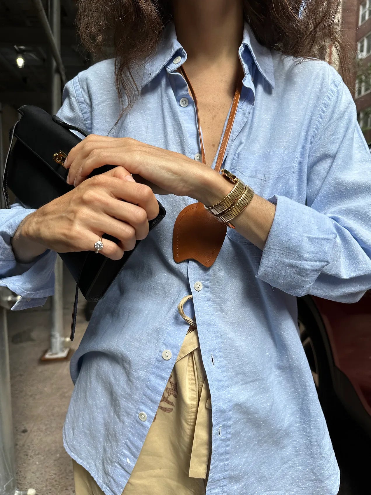 For this one, I focused on the camel leather chord around my neck (which I have been wearing a lot this summer with flimsy outfits — defined as those with no clasps or zippers to anchor them in a city). I chose it here for the classic color pairing it makes against the light blue shirt and the material contrast it makes against the lightweight poplin.