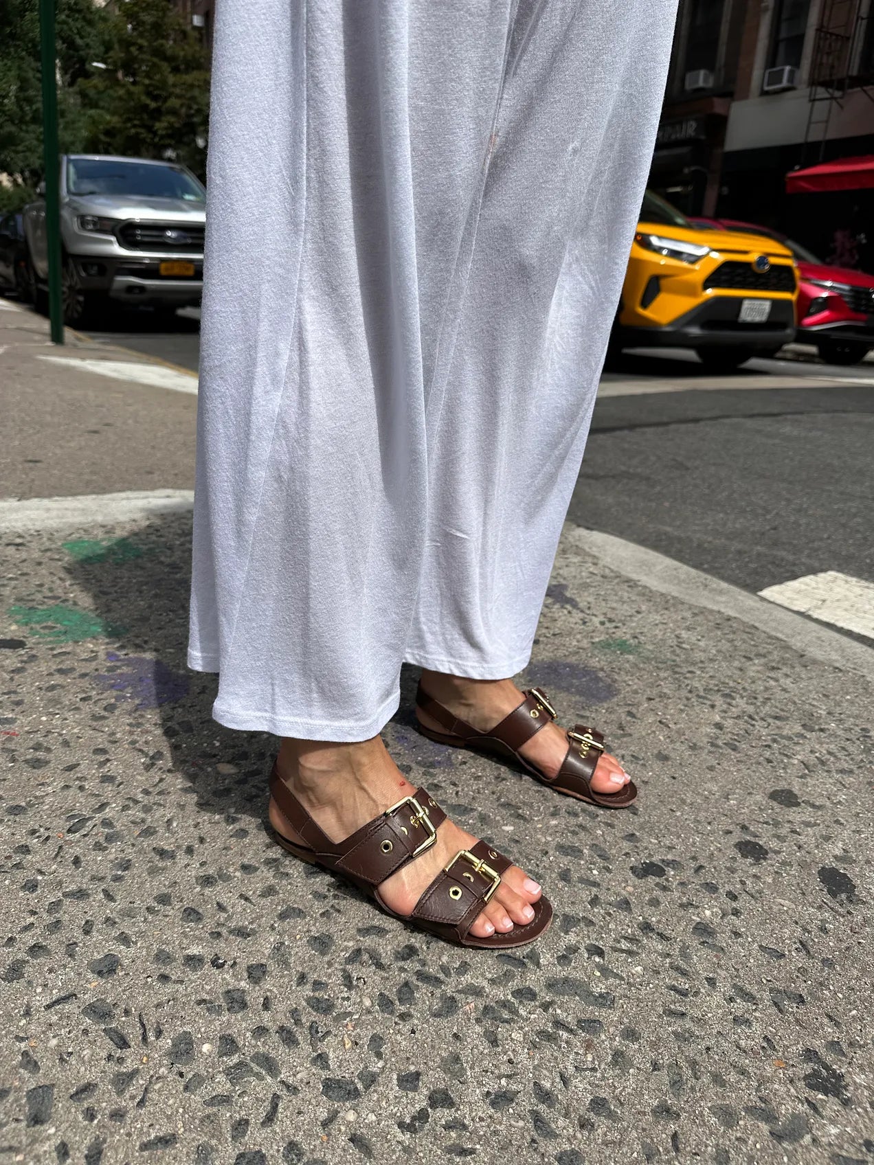 Whatever shoe falls into this category for you does not have to be as specific as Jamie’s — fishermens would do, or a structured ballet flat, even a comfort-first platform like this. Perhaps the exception to ensuring a back strap (which is like a period at the end of a soft outfit’s sentence) is a sandal with hardware like this.