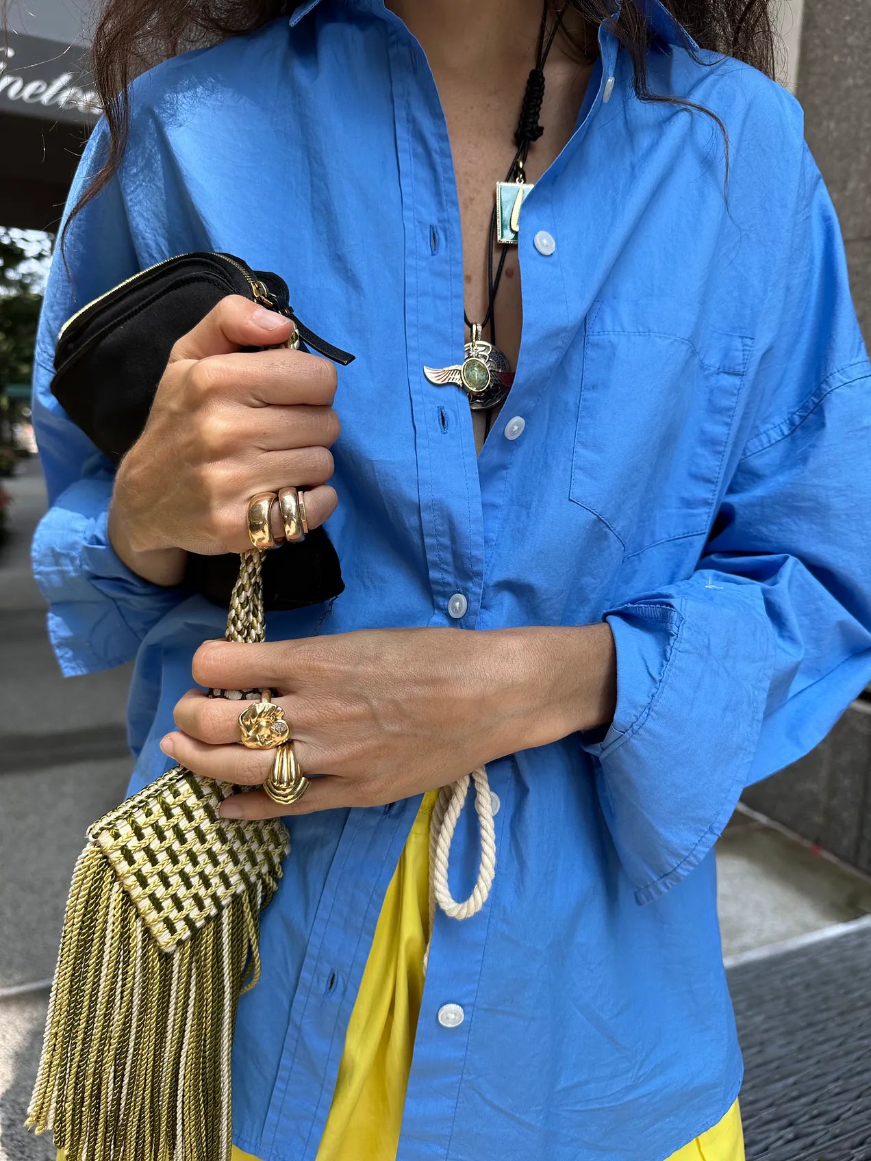 With this look in particular, the black chord was a conscious choice to anchor the look in a dark neutral around the bright blue and yellow. It’s also what ties back to the bag, which is soft and satin, so constitutionally similar to the chord as far as material.