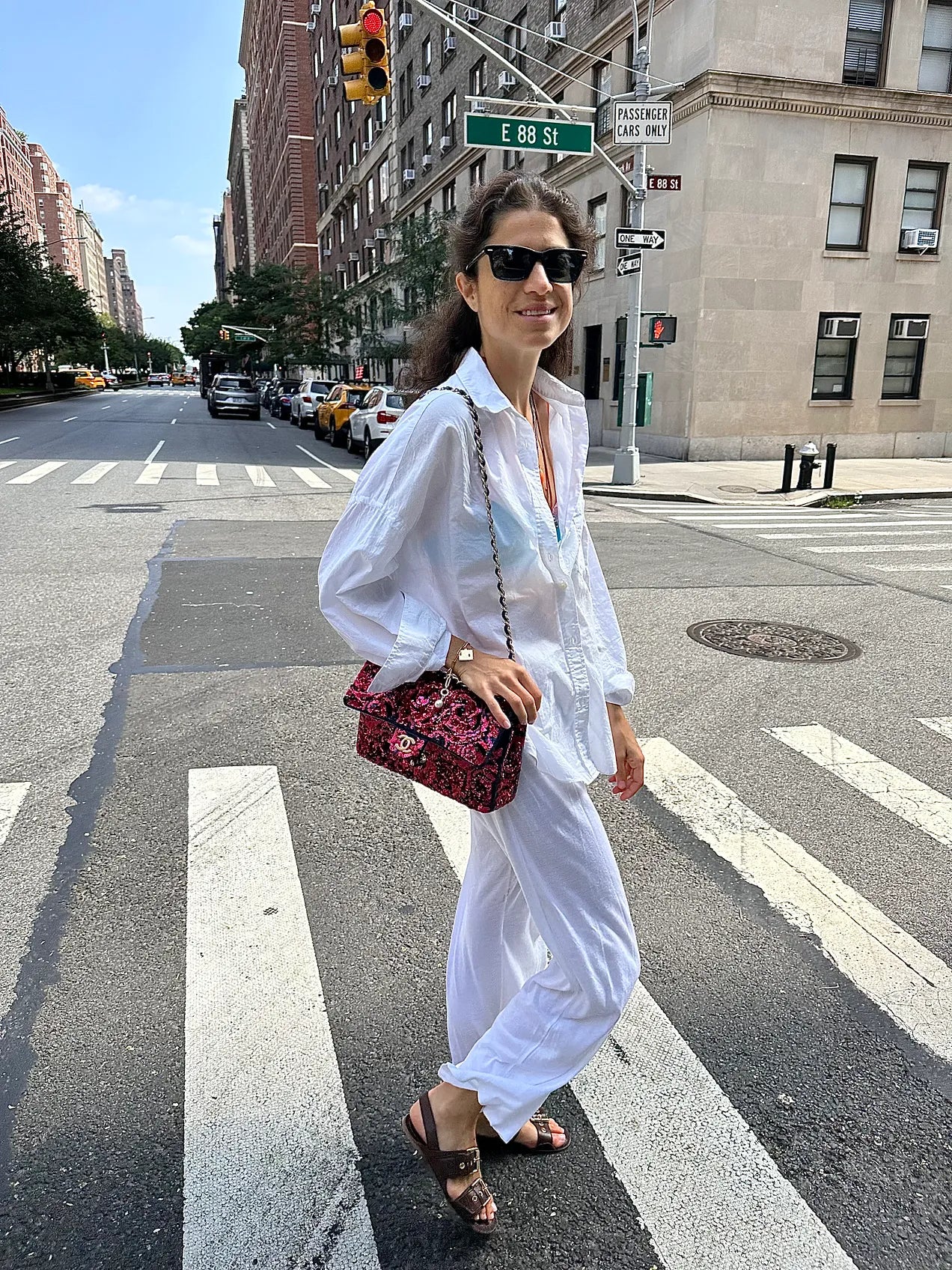 One more time that’s: LMND button-down shirt; I wear a size small in these shirts, Donni jersey pants (hey! It looks like for $790, you can get them from The Row; this pair from Hanro is great too, and here’s a pair from La Perla that is less sheer — I actually have these too, and sized up so they would fit a bit baggier; the L that is left would be good if you typically wear between an S and M. (Not to be confused with S&M.) The Row sunglasses, which are a spin on Ray Ban’s classic wayfarer and then here is one bag to accomplish the frills of the one I’m holding (I love this brand) and one for the chain effect.