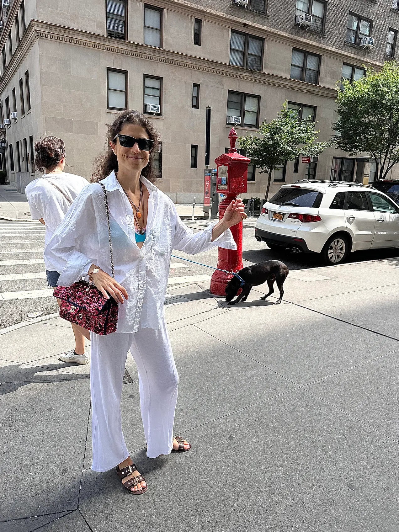 The one thing I’ll say is that the black flip flops and bag are a deliberate pairing to catch each other with mutual color but contrasting vibe (formal bag tying back to the watch and ring, laidback shoes tying back to the necklace, but rendered in the same color as each other) to create TOTAL COHESION. So that’s how the science of this one works.