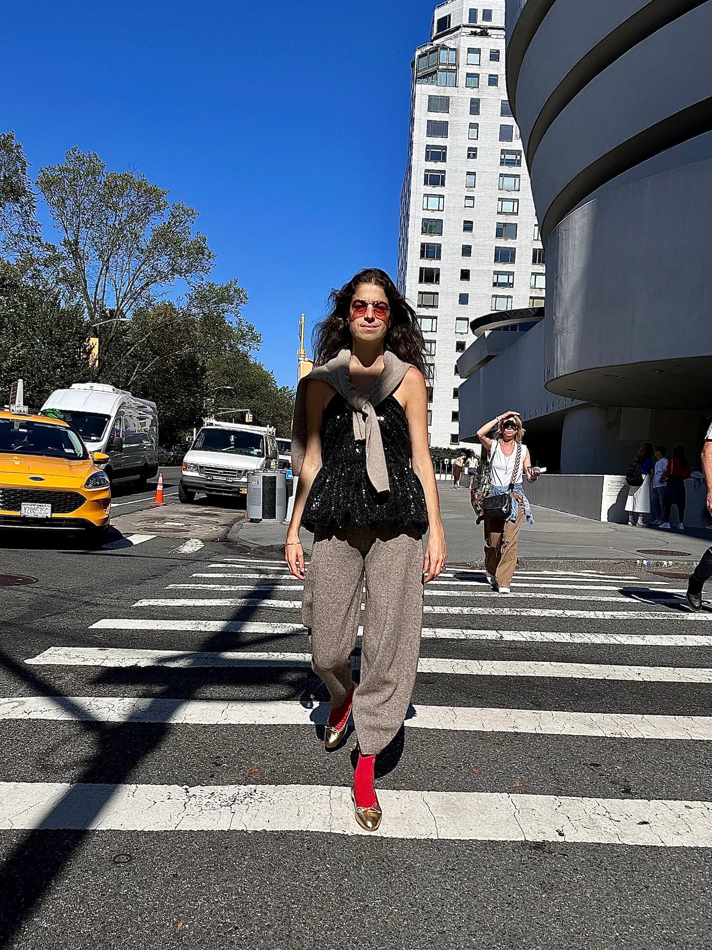 The proportion gives the pairing more character. By Malene Birger pants, Rotate Birger Christensen sequined halter top (I think it’s a good deal at $250 when you consider you can probably also wear it to a wedding), Falke socks and Manolo Blahnik ballet flats