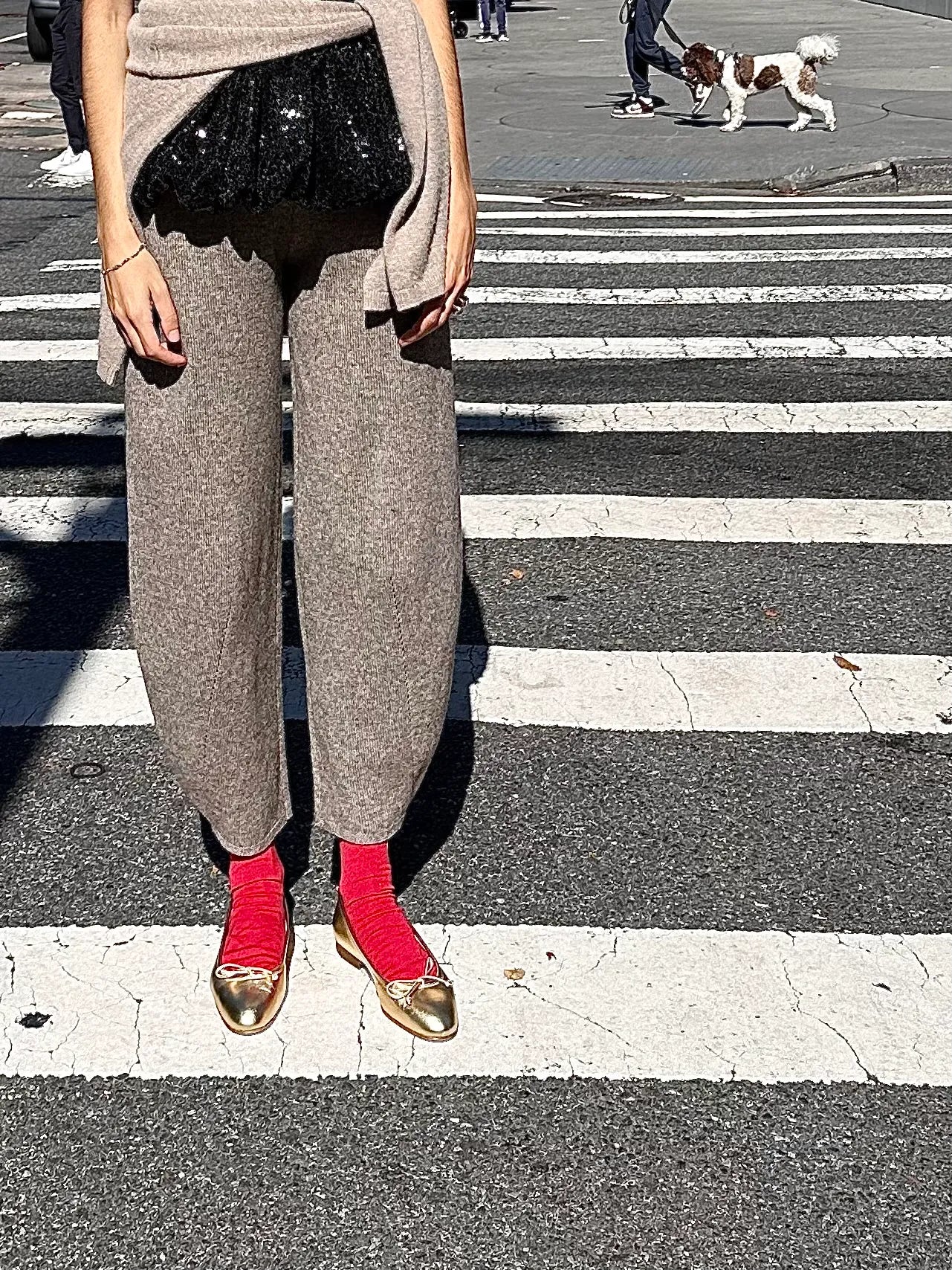 The easiest way to get into it is probably with a bag — something adventurous like this belted one from Gabriel For Sach ($325) pair of shoes — like these flats (red socks, black mini skirt, ivory knit), though if you’re going to do it, you probably really want to do it, you know?