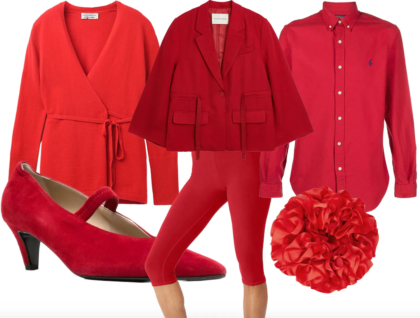 Knits in the full range from “roasted tomato” to “fiery squash” and the more common names like poppy and bordeaux are everywhere. I maintain that a layering turtleneck is the best red item to add to your wardrobe — it’s like a little kick for your everyday black and whites, beige and navies, or denim and browns but I do love a classic button-down too, and I’d be remiss to leave out my very own cashmere wrap sweater, these heels from Toteme or this blazer from By Malene Birger.