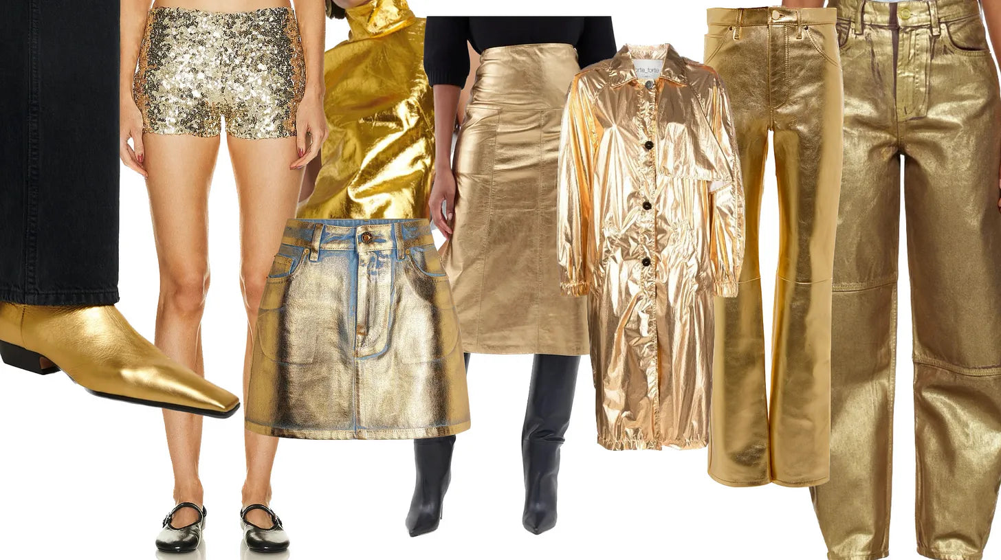 From left: Khaite boots ($1380; have been waiting for these to populate on TRR to suggest as an alt), Bode tap shorts ($660), Dries van Noten top ($681), Paco Rabanne mini skirt ($650), Cefinn mid-length skirt ($610), Forte Forte gold trench ($355), Dodo Bar Or leather pants ($596), Ganni jeans ($370)
