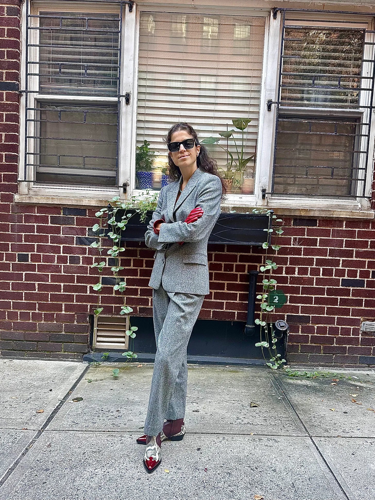 Bouguessa grey tweed suit, By Malene Birger gloves, Aeyde cowboy boots (also nice is the snakeprint in kitten heel boot form), Warby Parker sunglasses