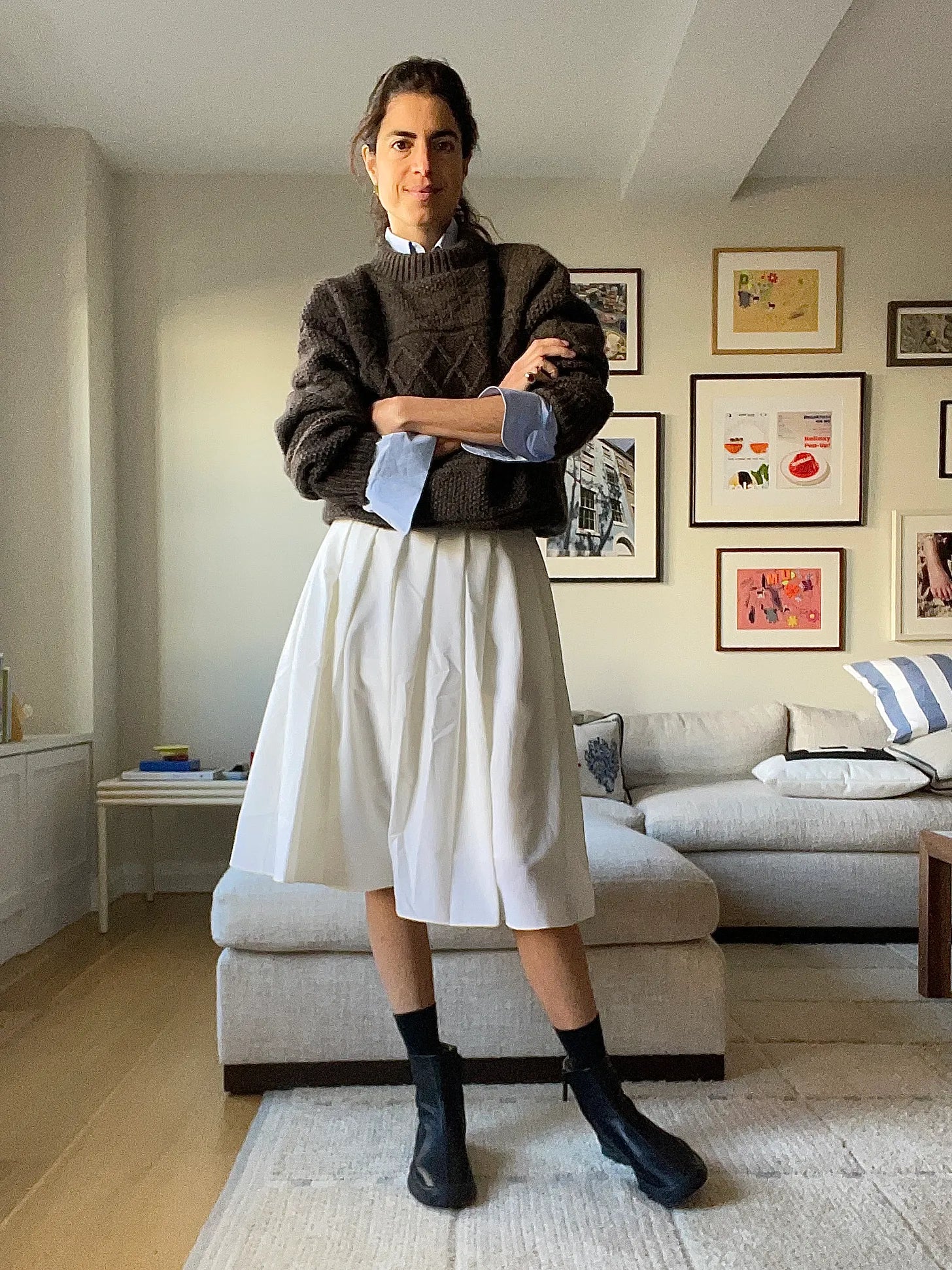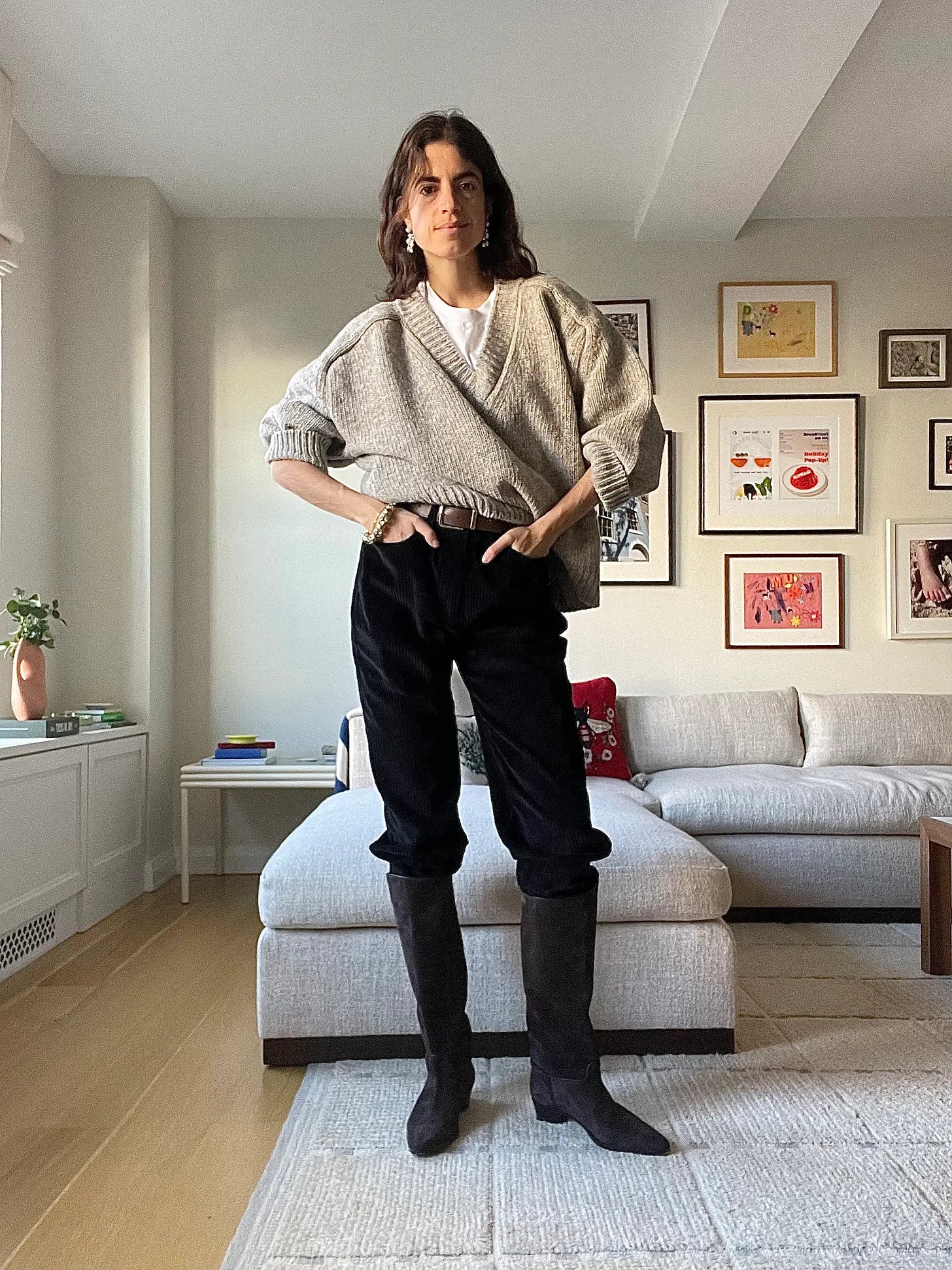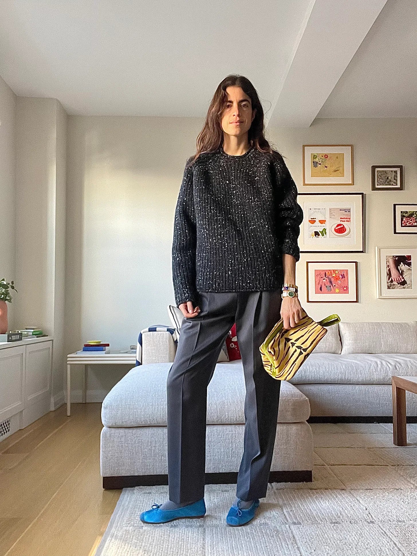 Here’s that Toteme sweater again, this time with Emi Mess pants. A good comp for the shoes could be, dare I say, these Margiela Tabi flats (the last thing I bought before a short shopping fast), and a toiletry kit from Man Repeller’s first product drop ca. 2018. Someone really wants it!