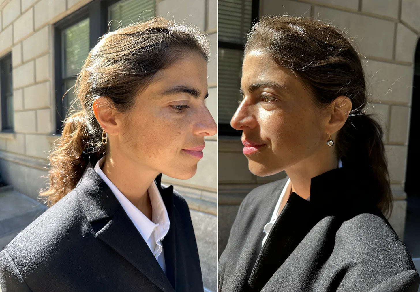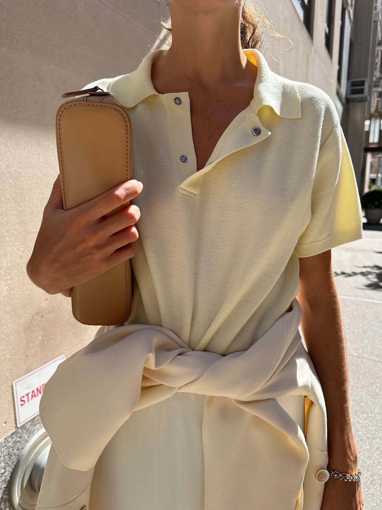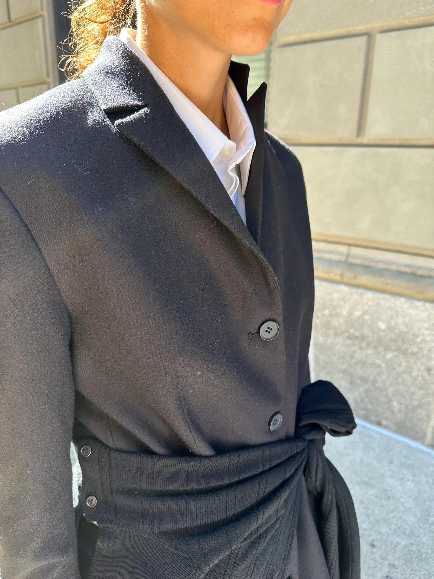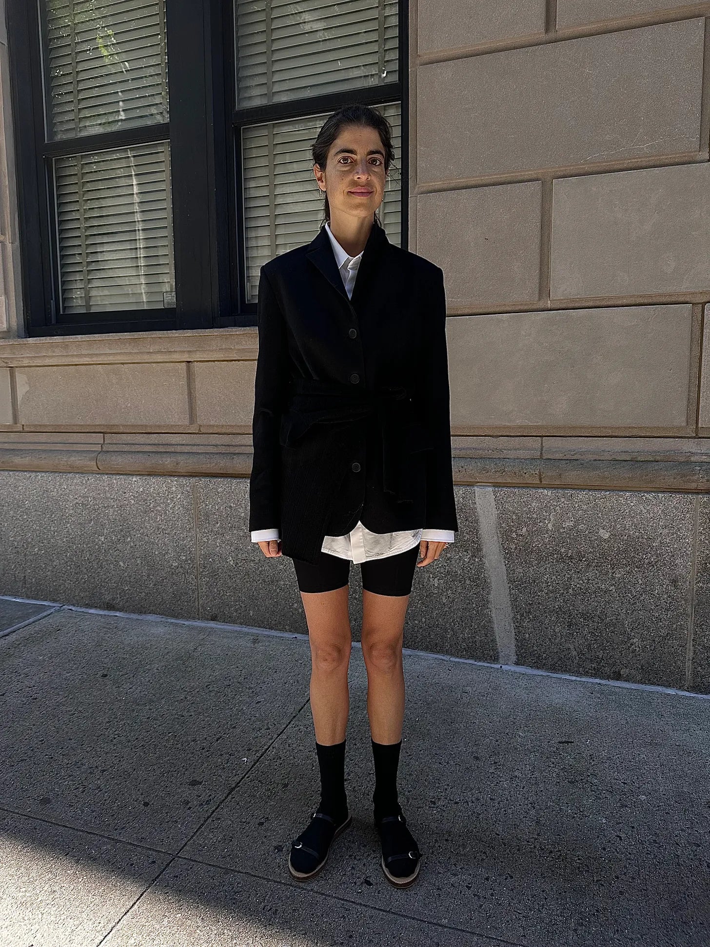 Here we have a single-breast, 4-button blazer from the brand, Bobkova. Maybe the secret to feeling fresh in a blazer these days is trying a single-breast one (and pairing it with a skirt of some sort) — three good options from Acne, Sportmax and Toteme. I also just saw this one from Mango, can’t vouch for quality but it nails silhouette. The shirt is Abie’s (men’s button-downs are narrower and longer than women’s), Maria McManus bike shorts and Gabriela Hearst sandals. You can’t quite see it here but I used a black knit polo to cinch my waist for some shape. Better pic: