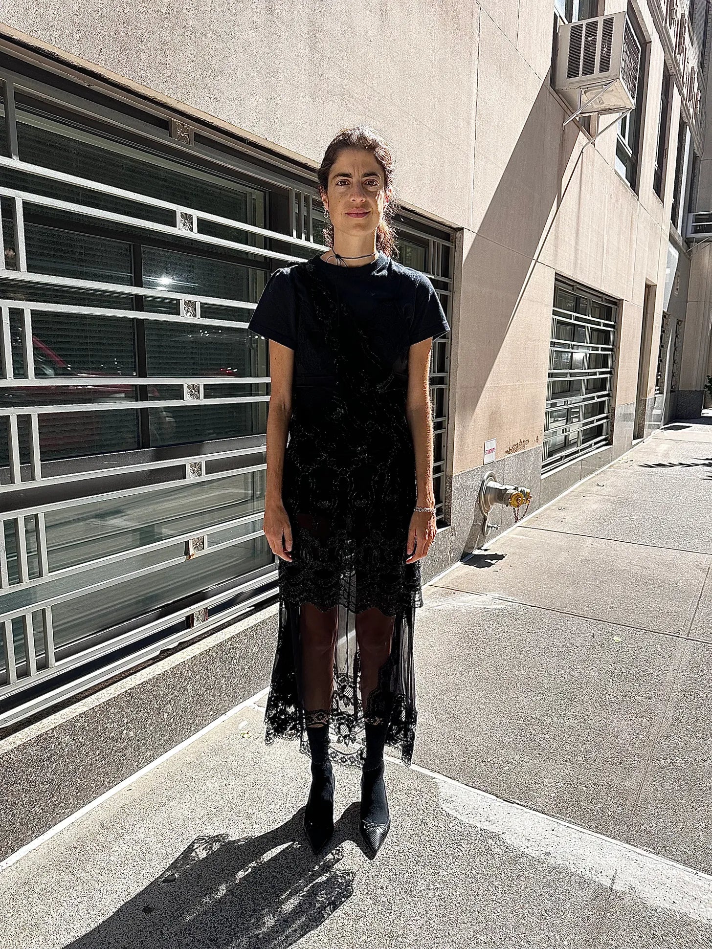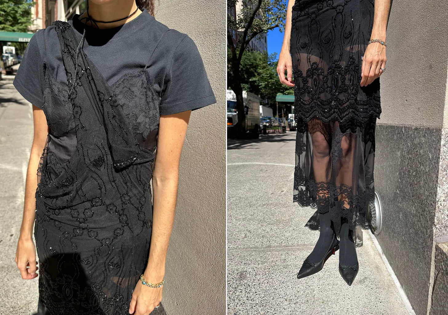 This one was fun to make! I’m wearing an old black see-through slip from Dolce and Gabbana (I also have this one, which I shortened a bit) that I got on The Outnet in 2015 (for a skirt, not dress, that does the same thing, this one from Mango seems worth it) with a black long-sleeved sheer beaded mini dress layered over.
