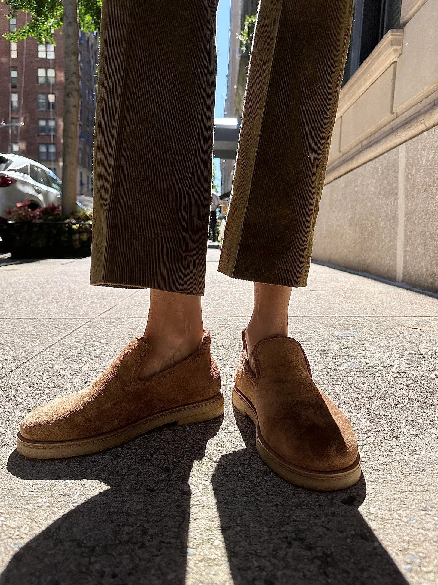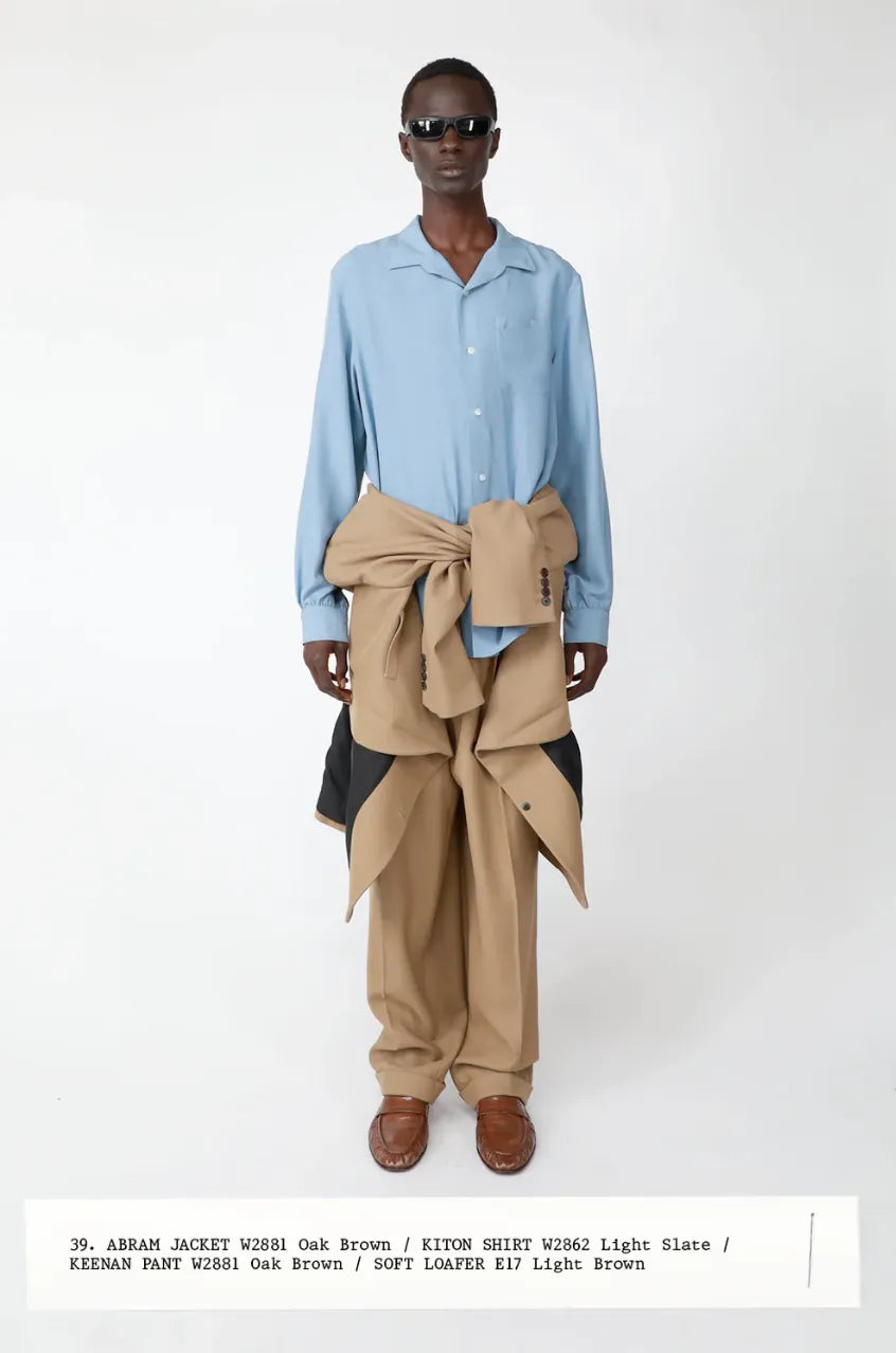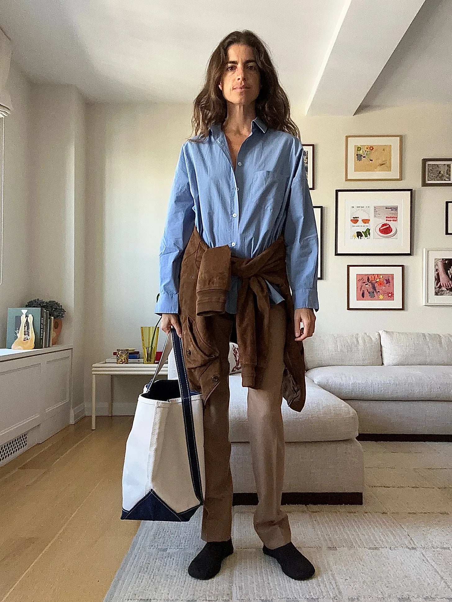I have a matching jacket for these pants, which are from a Berluti suit I had fitted to my form in 2019 for an event in Paris but the jacket wasn’t making a dramatic enough STATEMENT around my waist, so I used a Polo suede bomber that belongs to Abie to layer over the pants (these look good, but only one sz 0 left; these are more casual, but look really good). The shirt is LMND and the shoes are Loro Piana. Took creative license with the tote but more on it @ the end