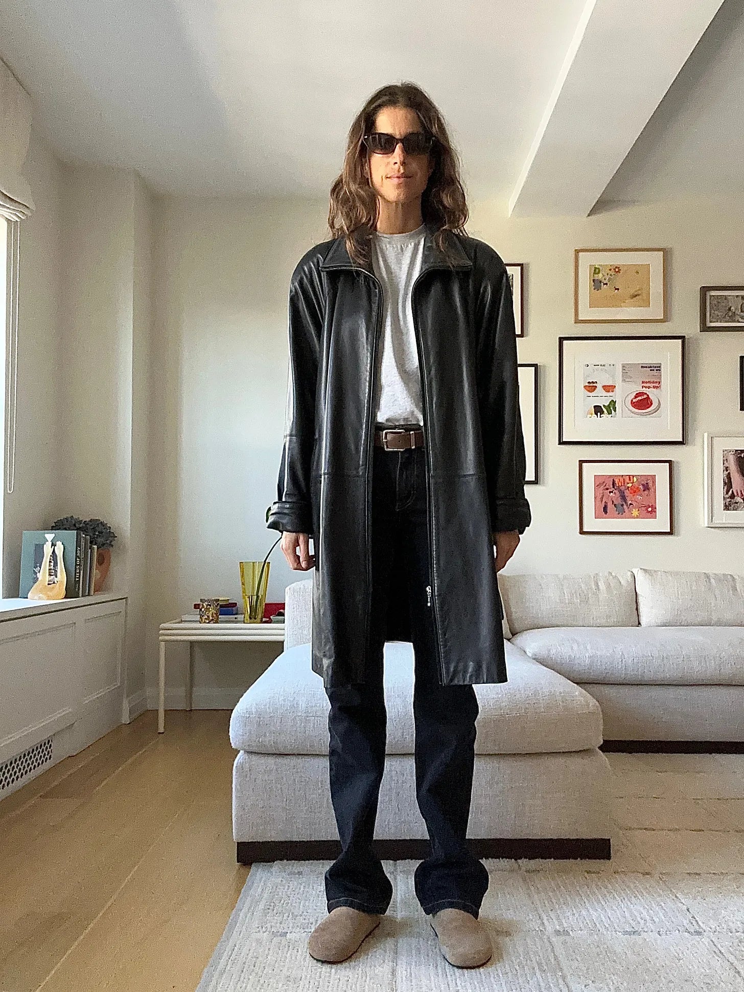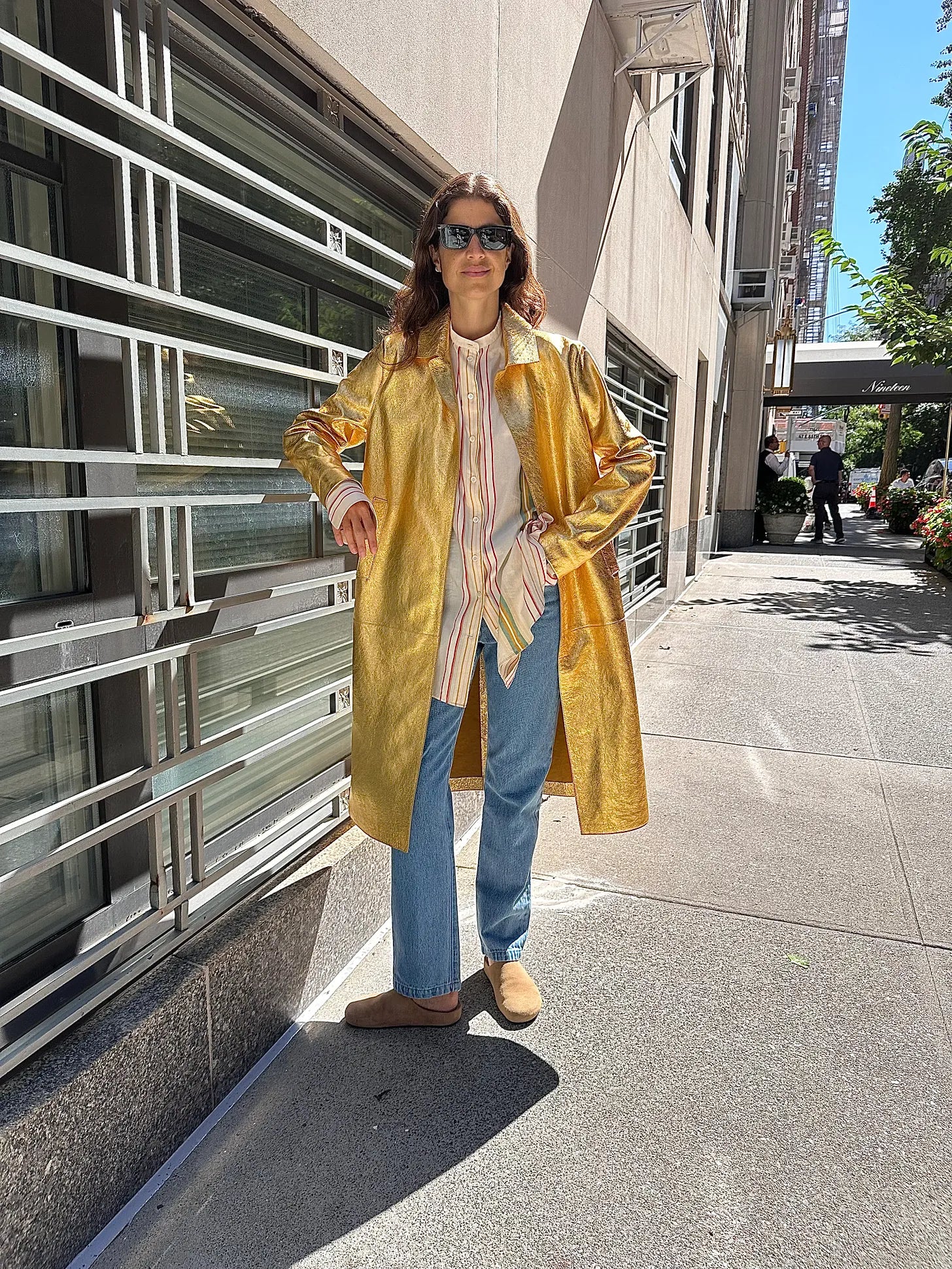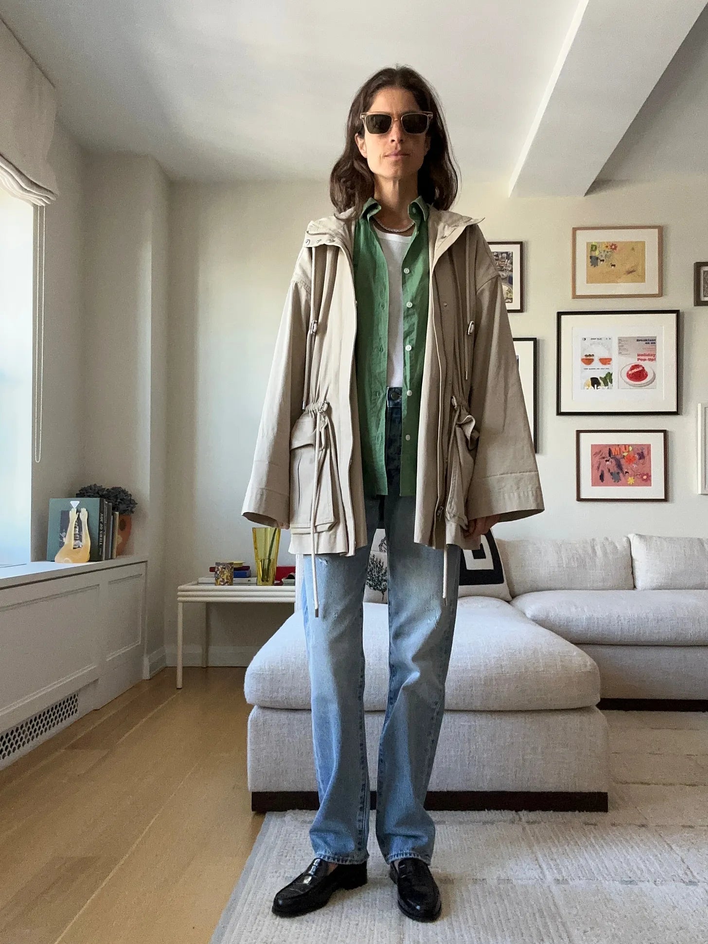 Skall Studios hooded anorak — maybe you remember when I fashioned myself into 27 proof points of its goodness?, LMND green button-down shirt (the exact color is gone, but this one still lives), Oliver Peoples sunglasses, white tank top from The Row; but why not try this one?, Levi’s mens jeans that I bought from a tip in Becky’s newsletter — I’m going to return them and size up from the 29 twice more (will be better belted, me thinks!)