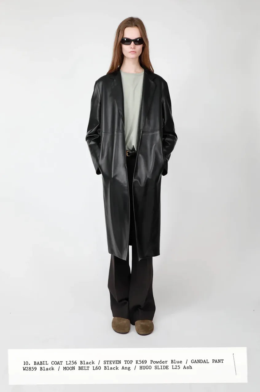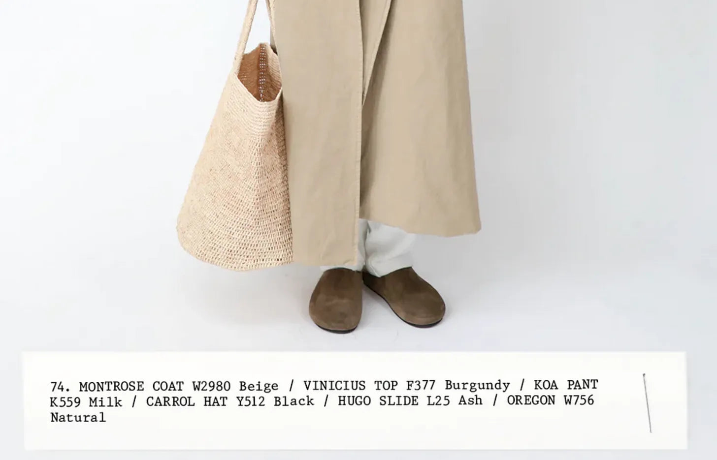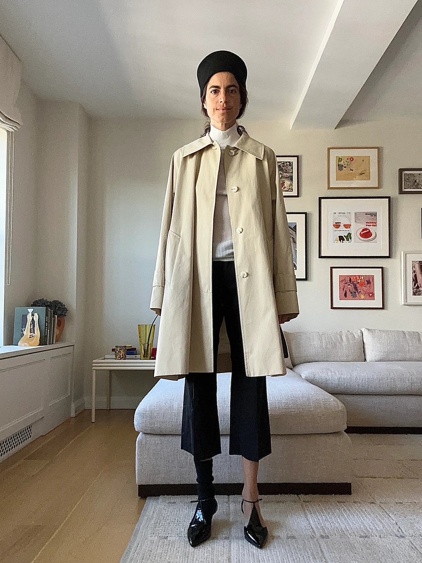 Skall Studios trench coat (not so far off is this one from Everlane; this one from Coach is a doll too), St. Agni white knit, Maria McManus pants (folded in), Emme Parsons ‘Leandra’ shoe. (The hat is de facto Row and on sale in white here)