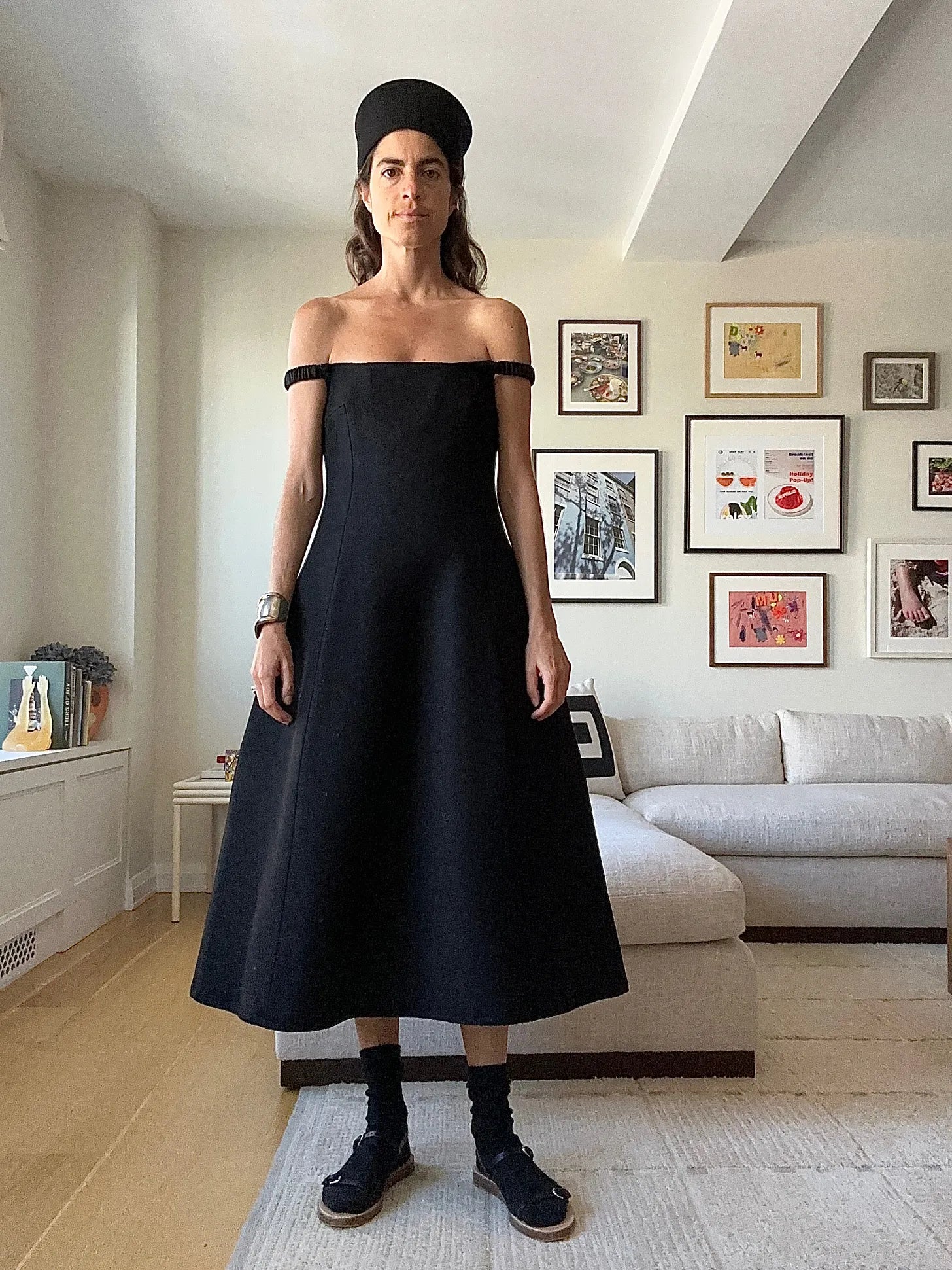 The formula here: black feminine structured dress (here in a sz 2, here in a 4 — mine’s a 2) plus unlikely edge (the hat!) times rough edge (the slouchy socks and wide-sole sandals)