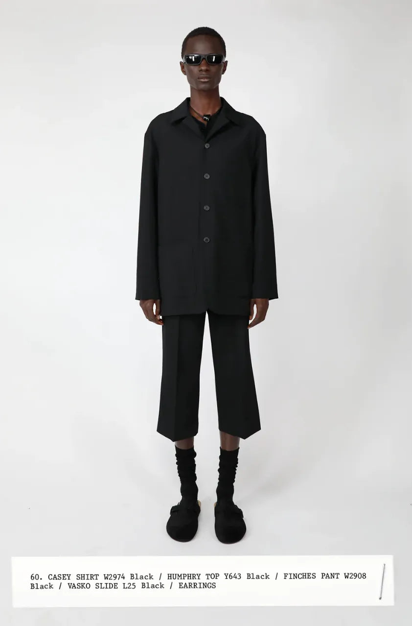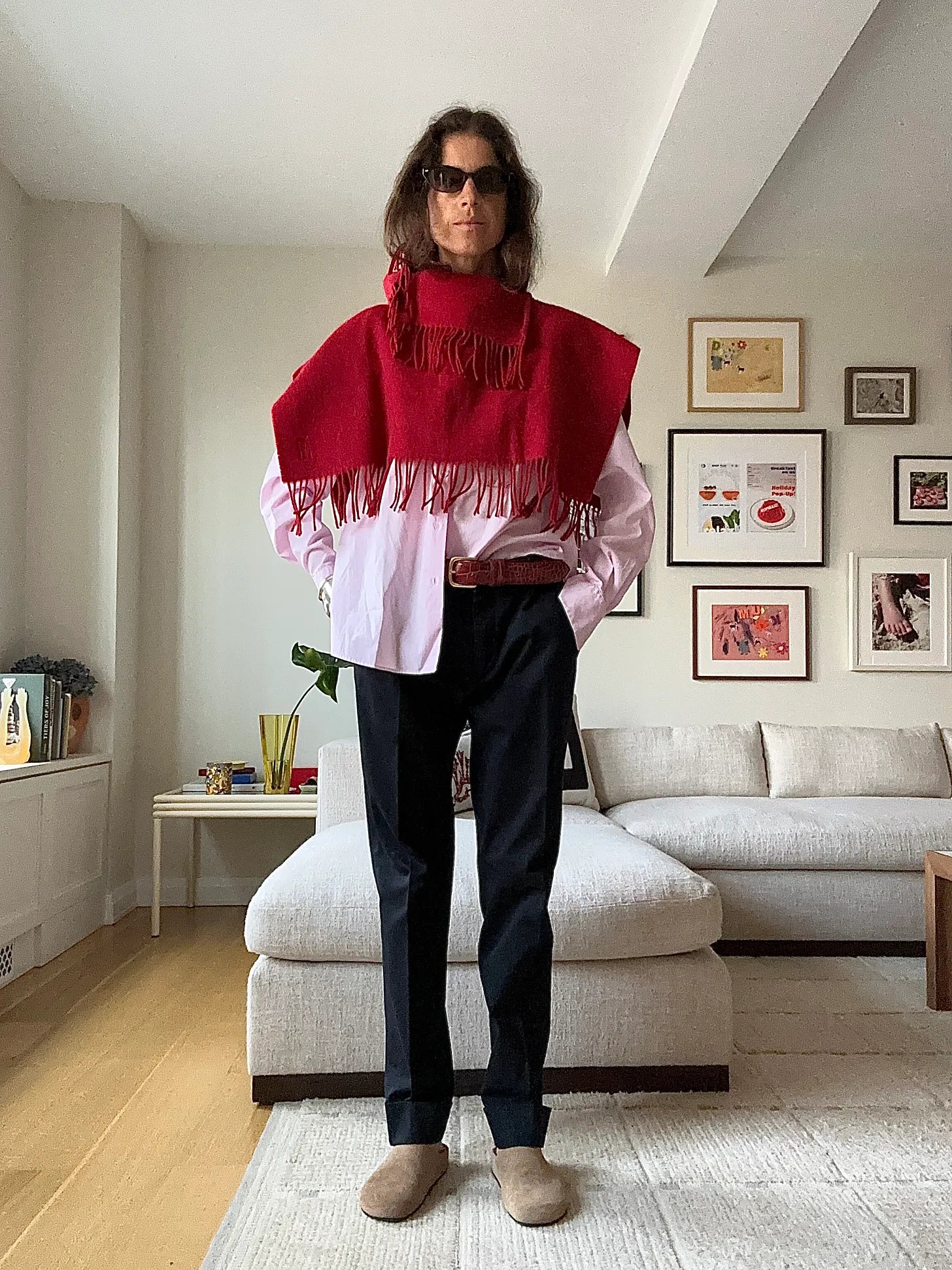 This one feels like the right color palette with a pink Sessei button-down shirt, Abie’s black slacks (they are Dries and cuffed at the ankle) and my own Jigsaw “clogs.” The fringe scarf is like that one delicate, but also rough curveball The Row is so good about employing (see: crochet lace gloves, comb necklace, THE HAT) in all their looks.