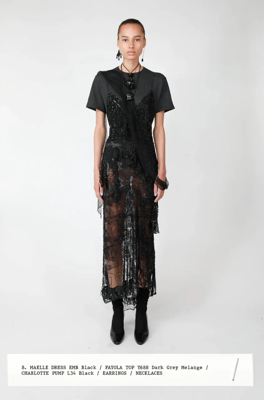 What I did was pull the embroidered dress up over my slip then tie the arms around my chest to create a similar (similar?) cascade effect. The rest of the look includes Khaite’s Emmylou t-shirt and a pair of Louboutin black slingback pumps. If you’re in the market for a pair of black slingbacks, get these. Oh! And as the season of leather chords with silver medallions hanging off of them is upon us (and employed in The Row look), do enjoy this link.