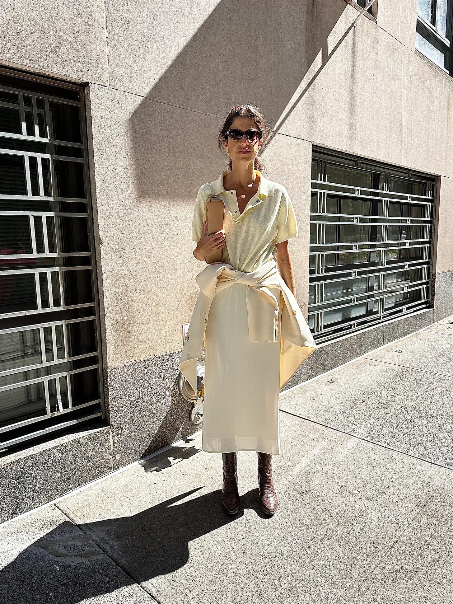 High Sport polo, Wardrobe.nyc blazer (in the theme of single breasts, I like this. In the theme of the Row…call me), The Row skirt (feels like cheating) and vintage cowboy boots I got from le real real for real real.