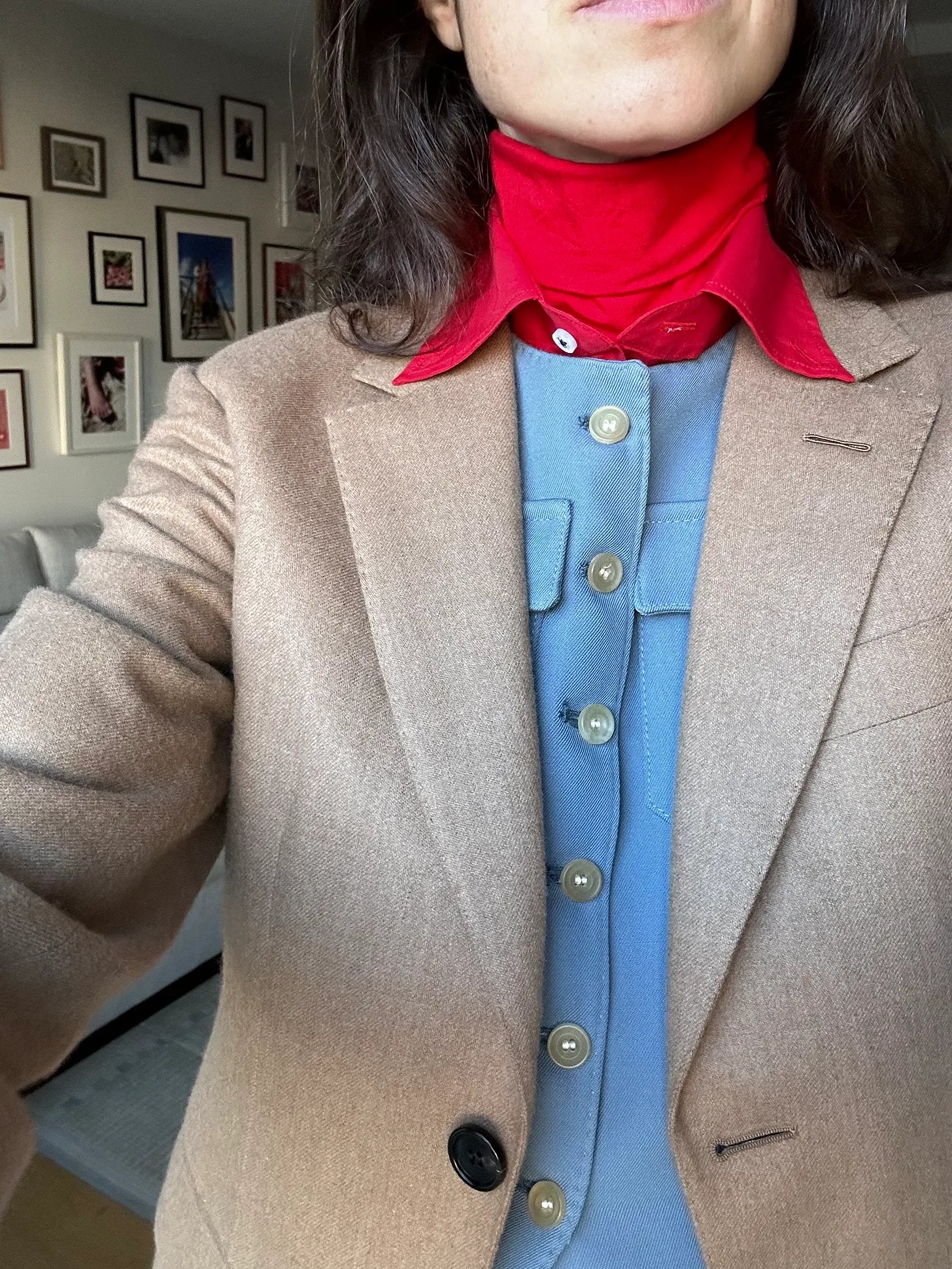 Turtlenecks/silk scarves were styled under button down shirts or in between layers of shirt, knit and blazer/ jean jacket.