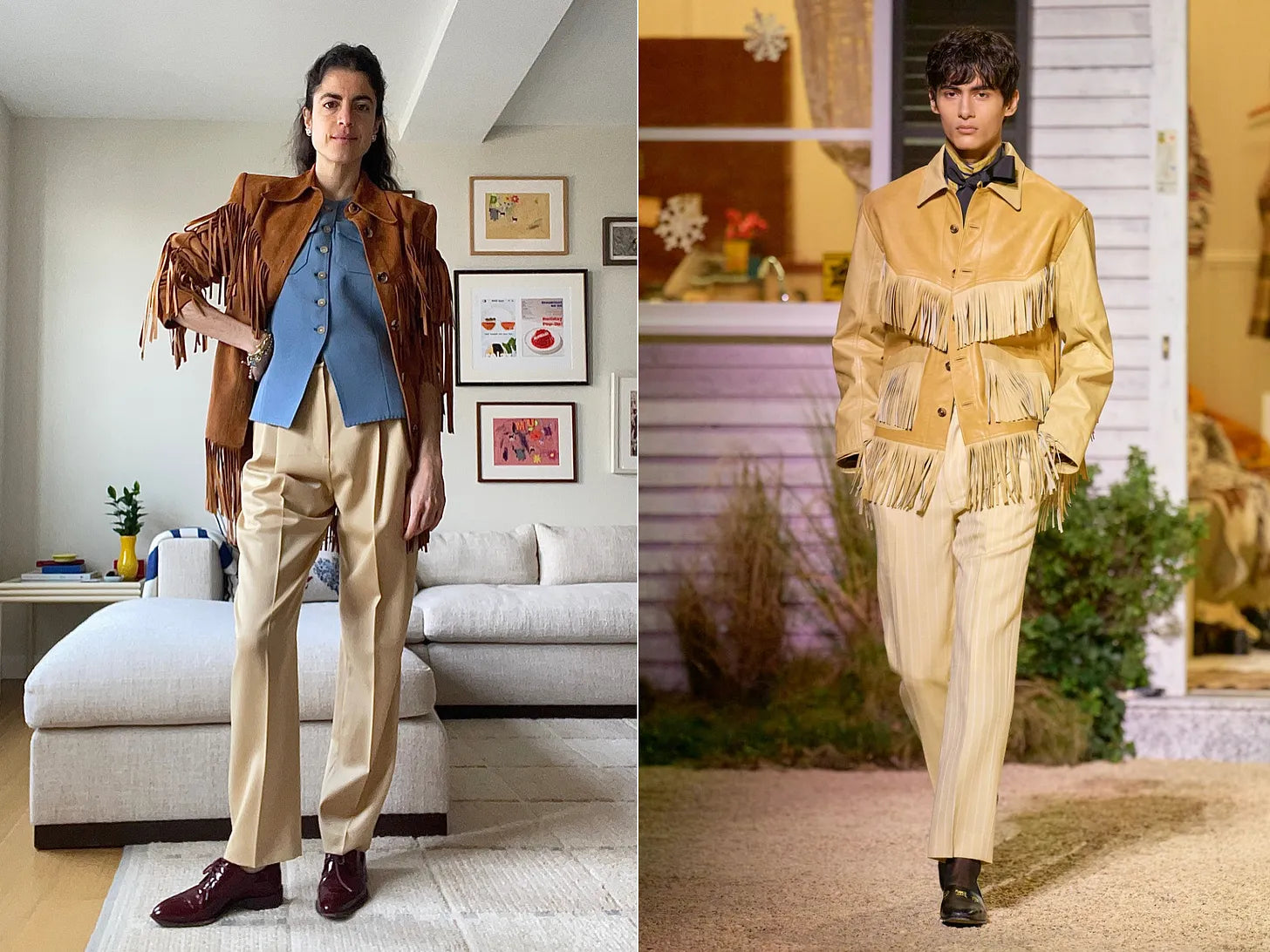 Khaite fringe jacket, Giuliva Heritage vest, Emi Mess pants, old Celine lace-ups (left); Bode Fall 2023 (right)