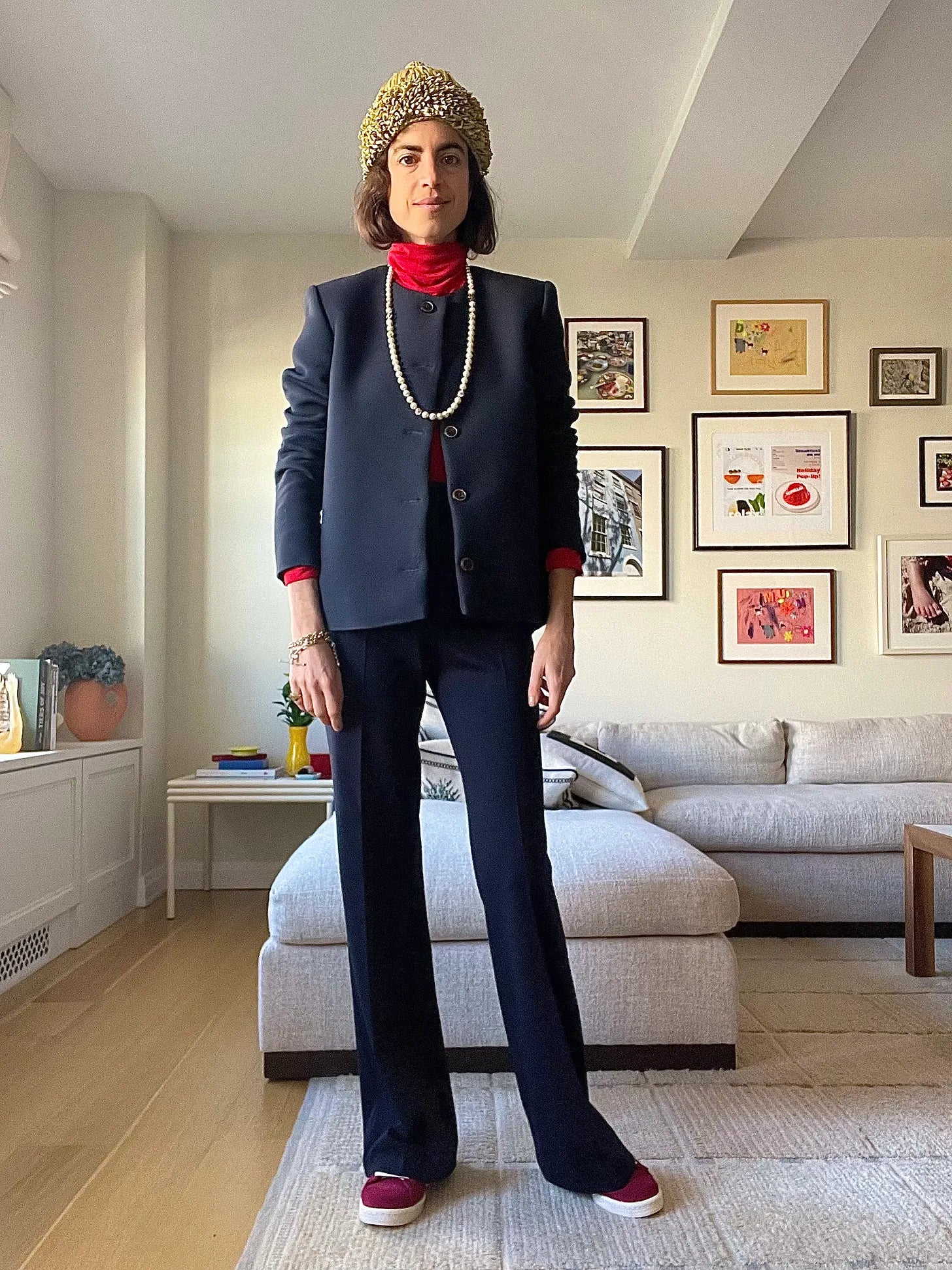 More pearls, less problems. Here’s a good jacket, a red turtleneck, these pants are Giuliva Heritage (but these on sale from Dries are good too) and the sneakers are Adidas’ Campus style