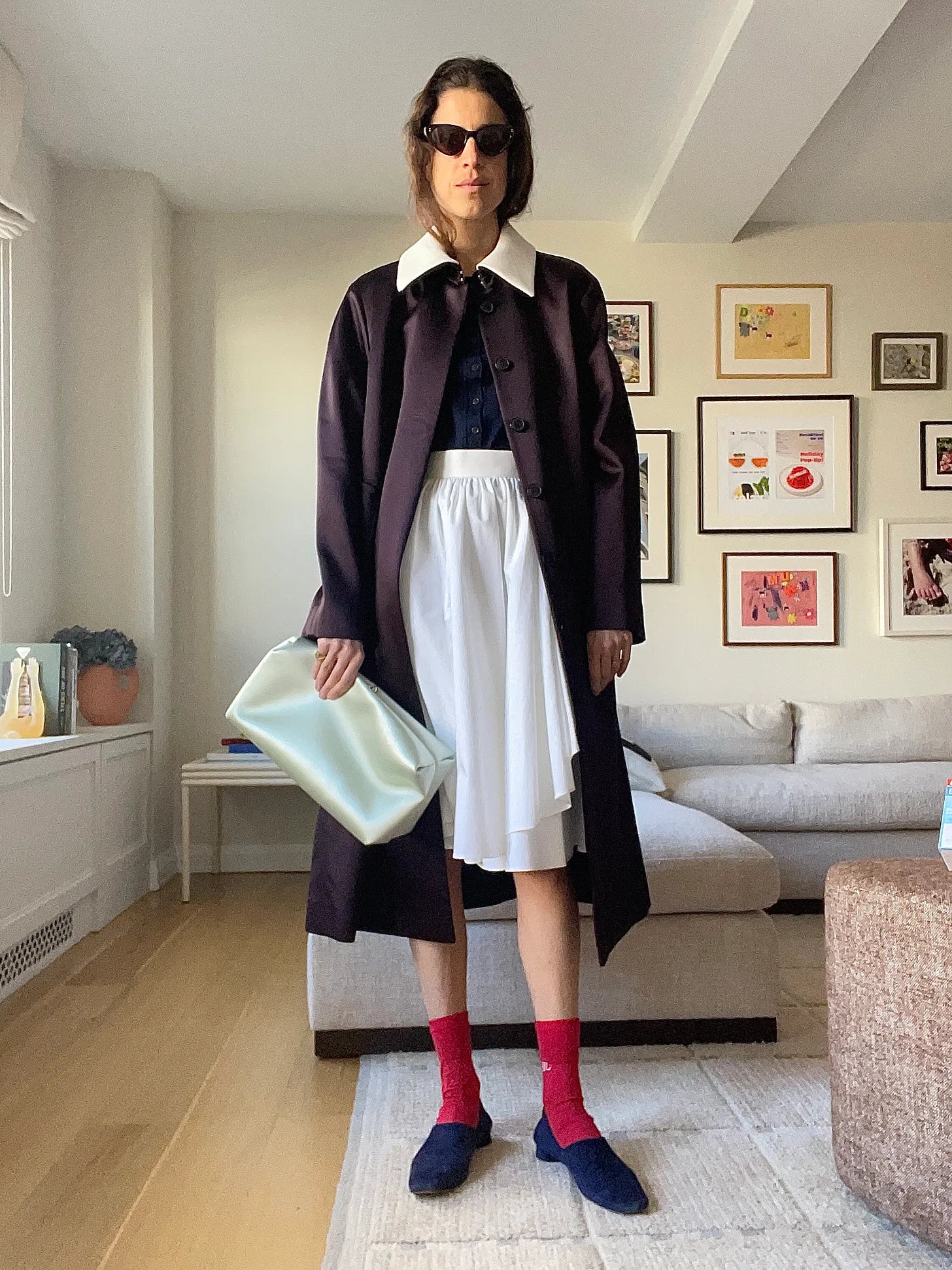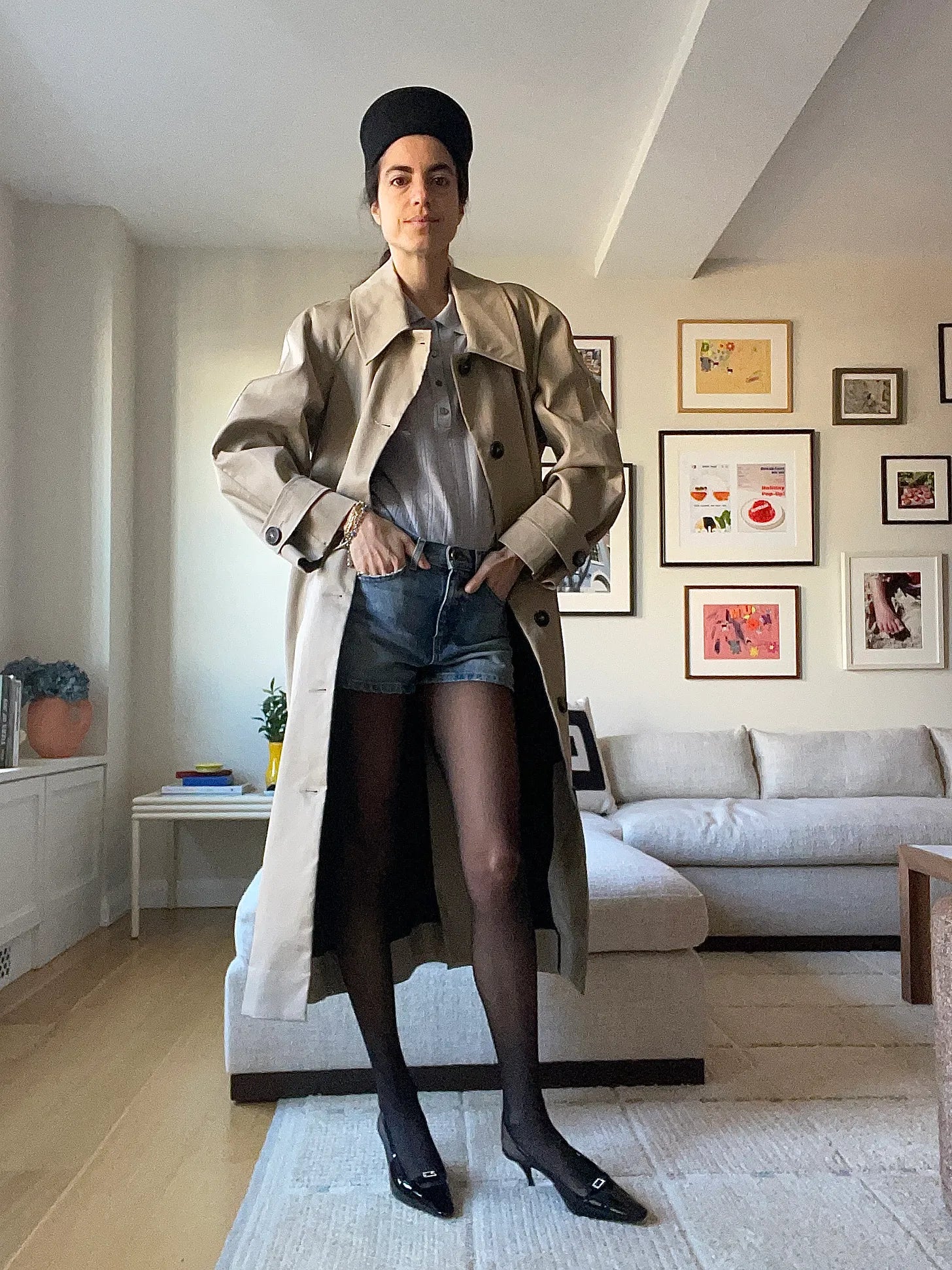 This hat from The Row retails for $790. Is it worth it to fashion yourself into the final smores course (in more ways than one!) from that Netflix movie, The Menu? Also wearing an Ines Aquino trench coat (here’s a whole breakdown on what makes a trench good), Venstore’s polo sweater (a cool new brand I have never spoken about not once in this newsletter), Khaite shorts (also a brand I rarely mention; like these ones too — would be good in this look w knee-high socks instead of full tights), with Swedish Stockings tights and Saint Laurent slingbacks. As a good alternative, I have test worn these from Me + Em! And they are great.