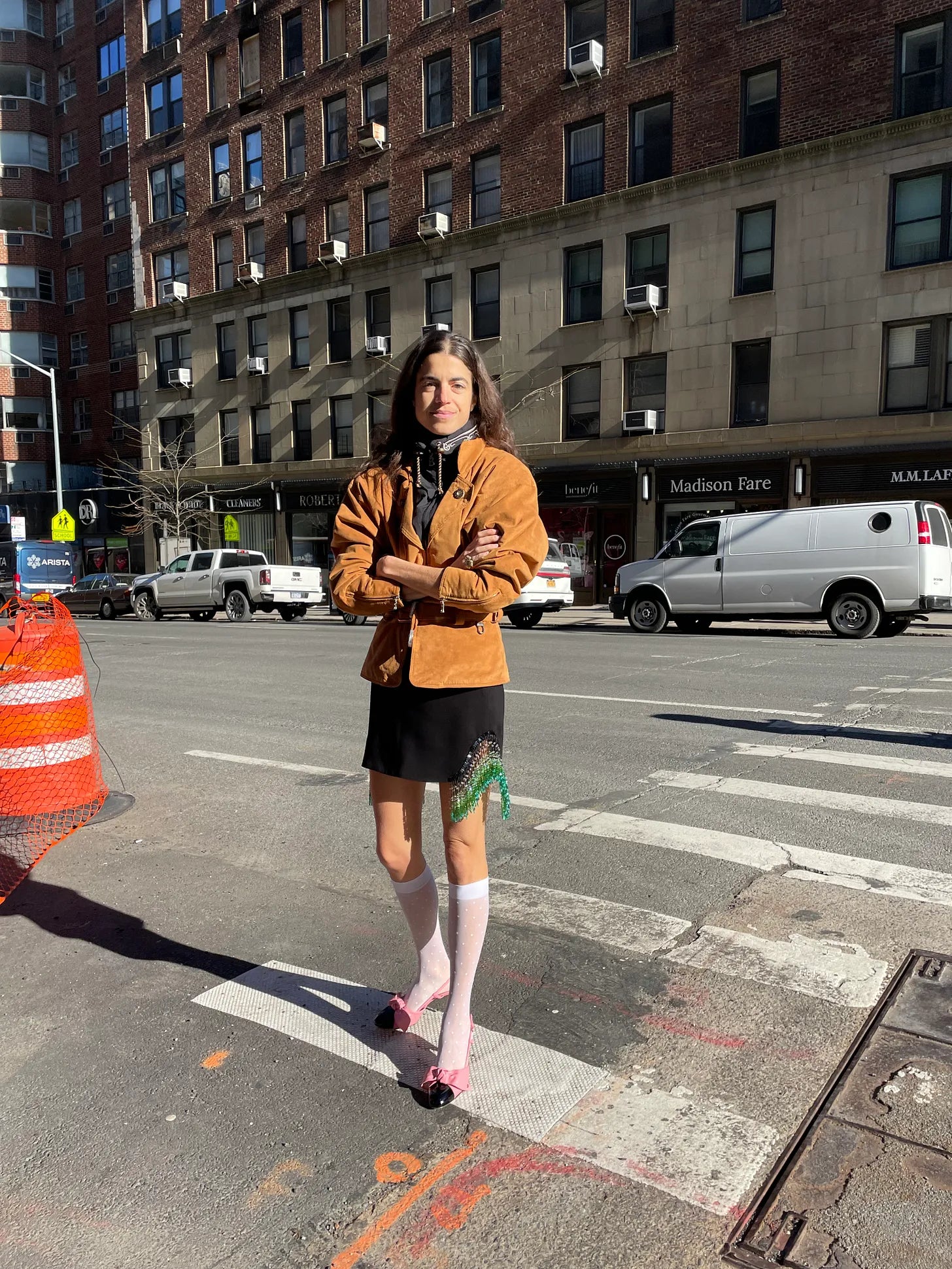 A great suede jacket by Bogner; you would not believe how many great jackets you can find on TRR (but also, you can approximate the same look as above with a beige blazer styled over a black windbreaker, which I have done before), styled with Nafsika Skourti’s beaded mini skirt (this one is so cute too), white knee highs and Gucci slingbacks