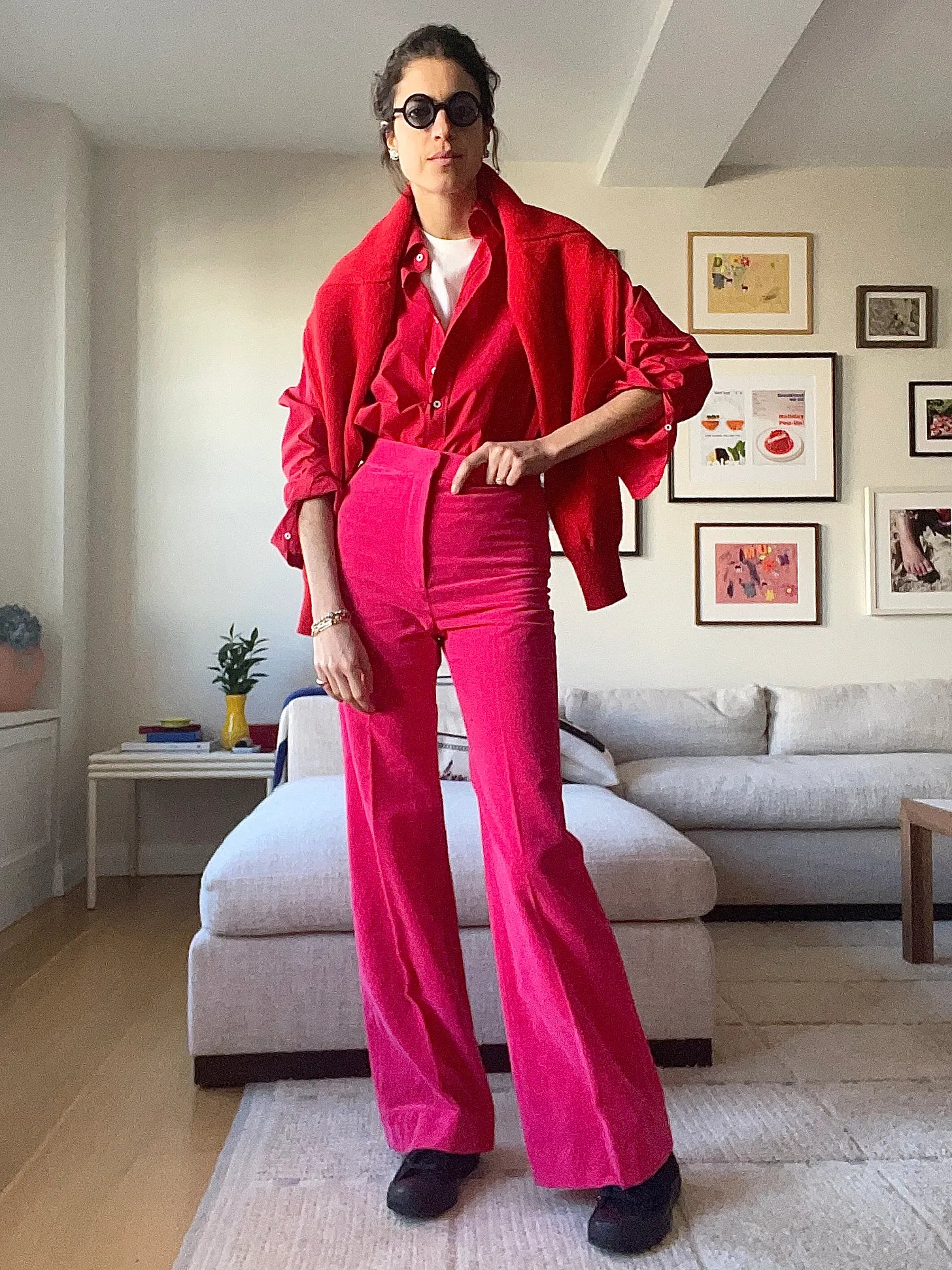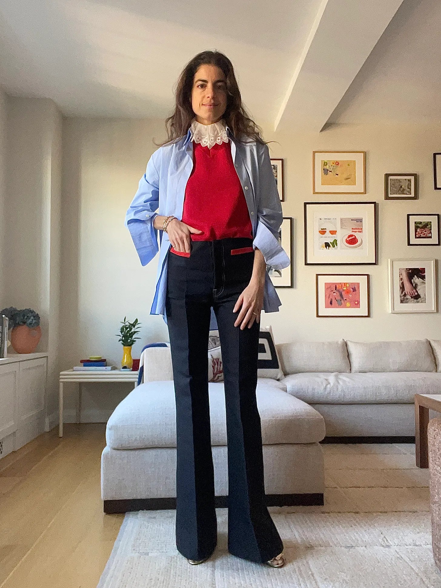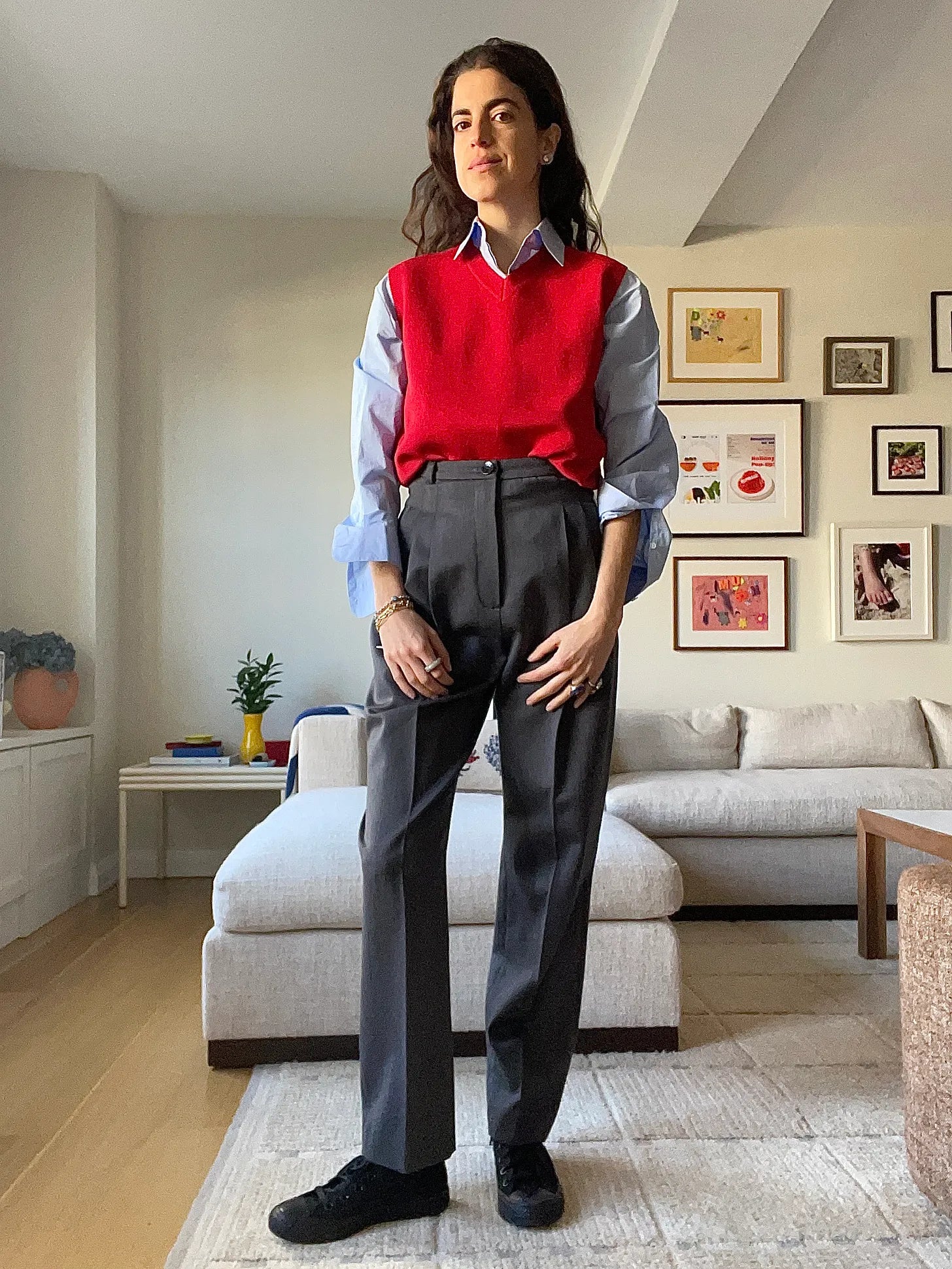 This is my “I watched Tár last night” look, featuring a button down shirt from Salie 66 (this one’s good), red vest from Maryam Nassir Zadeh, the omnipotent Emi Mess charcoal grey trousers (but they are indeed very expensive; here is a pair from Toteme, another from Maria McManus [blue] and one pair from Mango) and all-black Converse