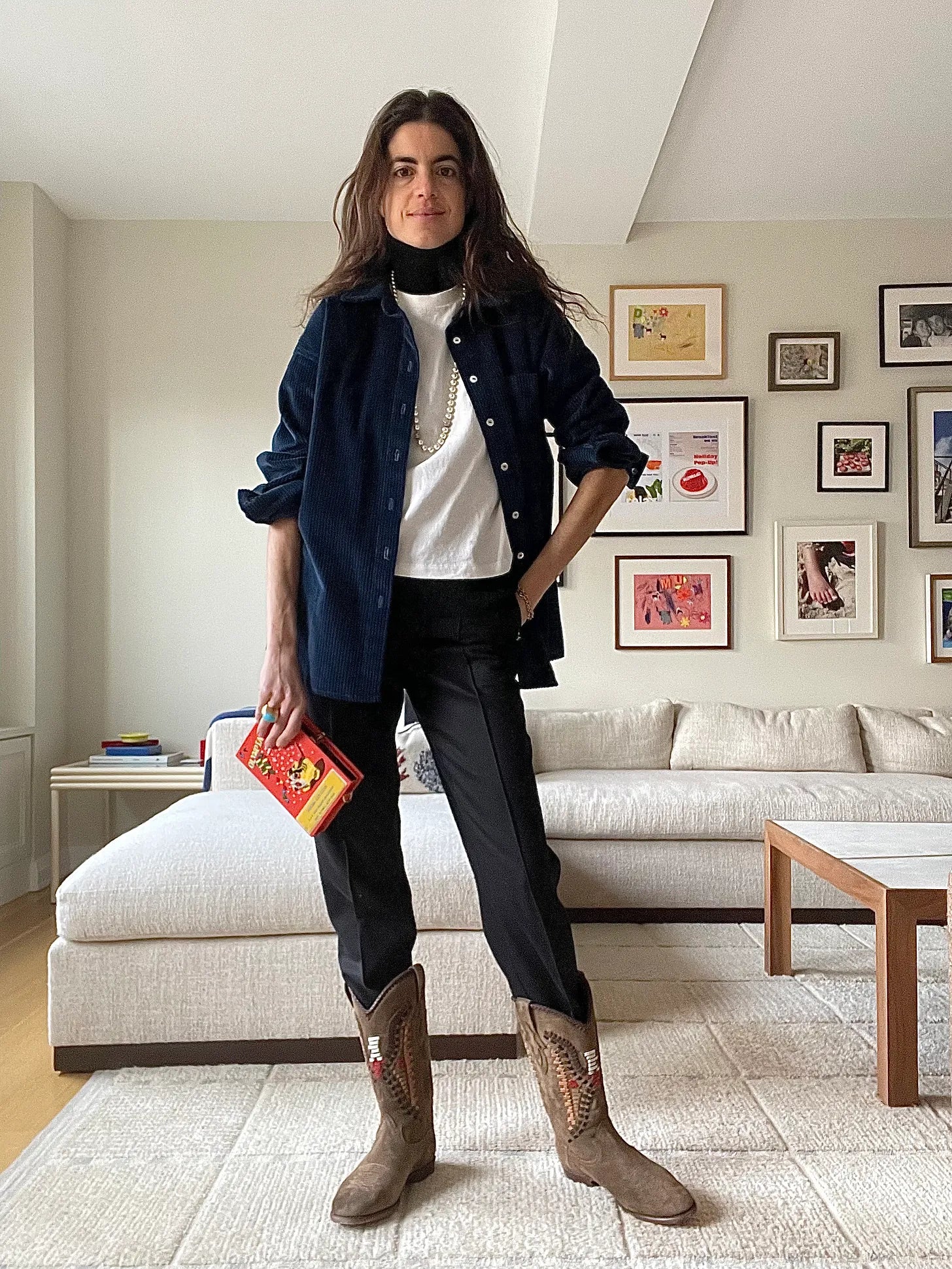Go on, do a spinal twist. This corduroy shirt is from Donni. (This one by Marni x Carthartt is awesome too.) I suspect you have good enough straight-leg black trousers to style with a white t-shirt worn over a black t-neck. If you are still on the fence about pearls, though, might I suggest you jump?)