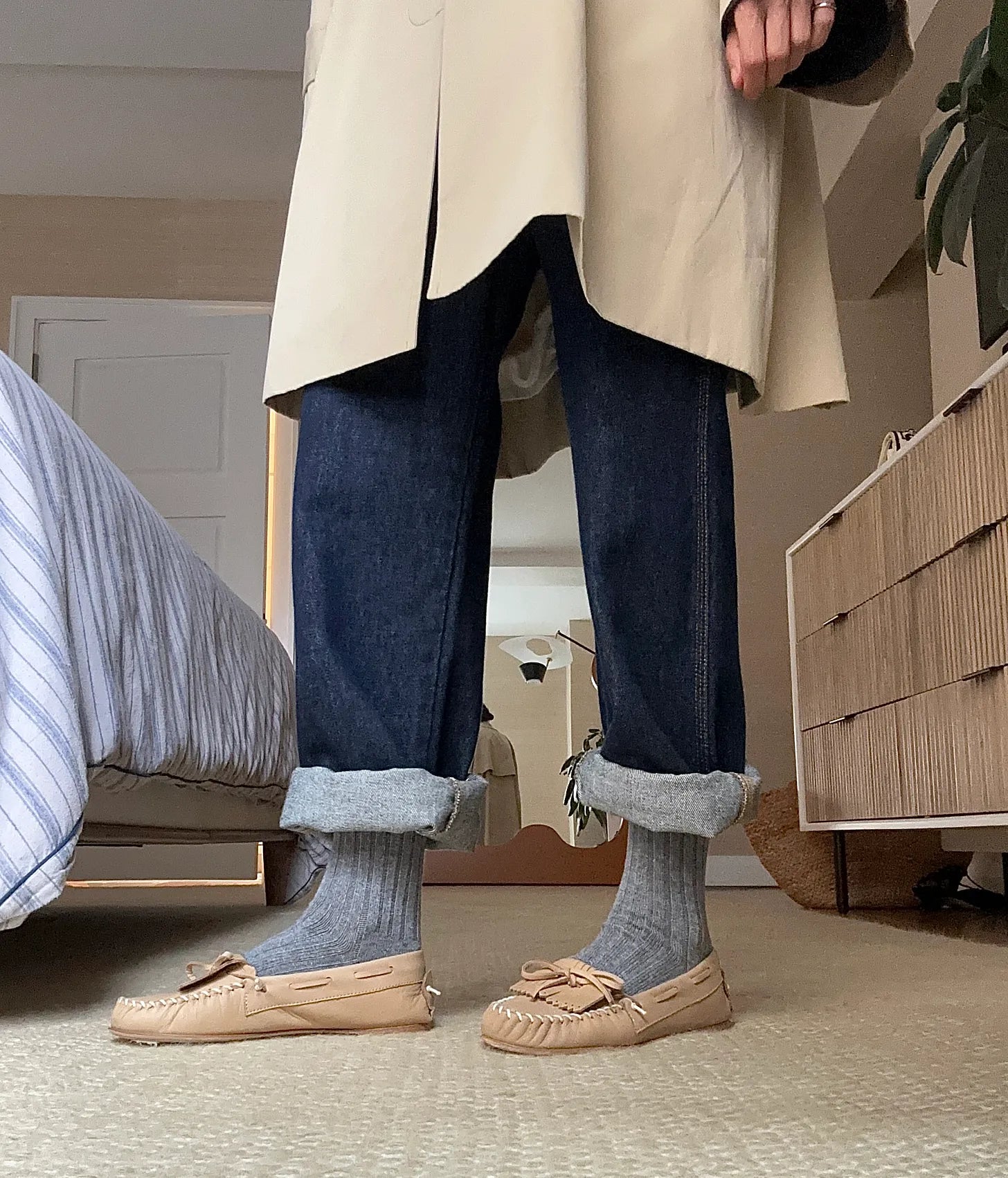 Brought the socks down a bit so you can see the break up between the leg cuff and the socks and changed into these suede ballet flats from Doen