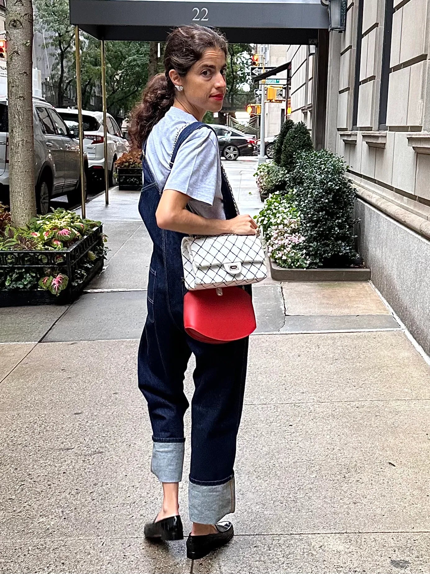 The ingredients are straightforward: grey t-shirt, sleek loafers (not usually one for a pair without the classic penny cross strap, but the cut on these from Emme Parsons hits the top of the foot in a really good place for matters of making your ankles look good) and overalls. The red lipstick is optional, but it adds something festive and the real bang that gives it some character is the pair of bags layered over each other.