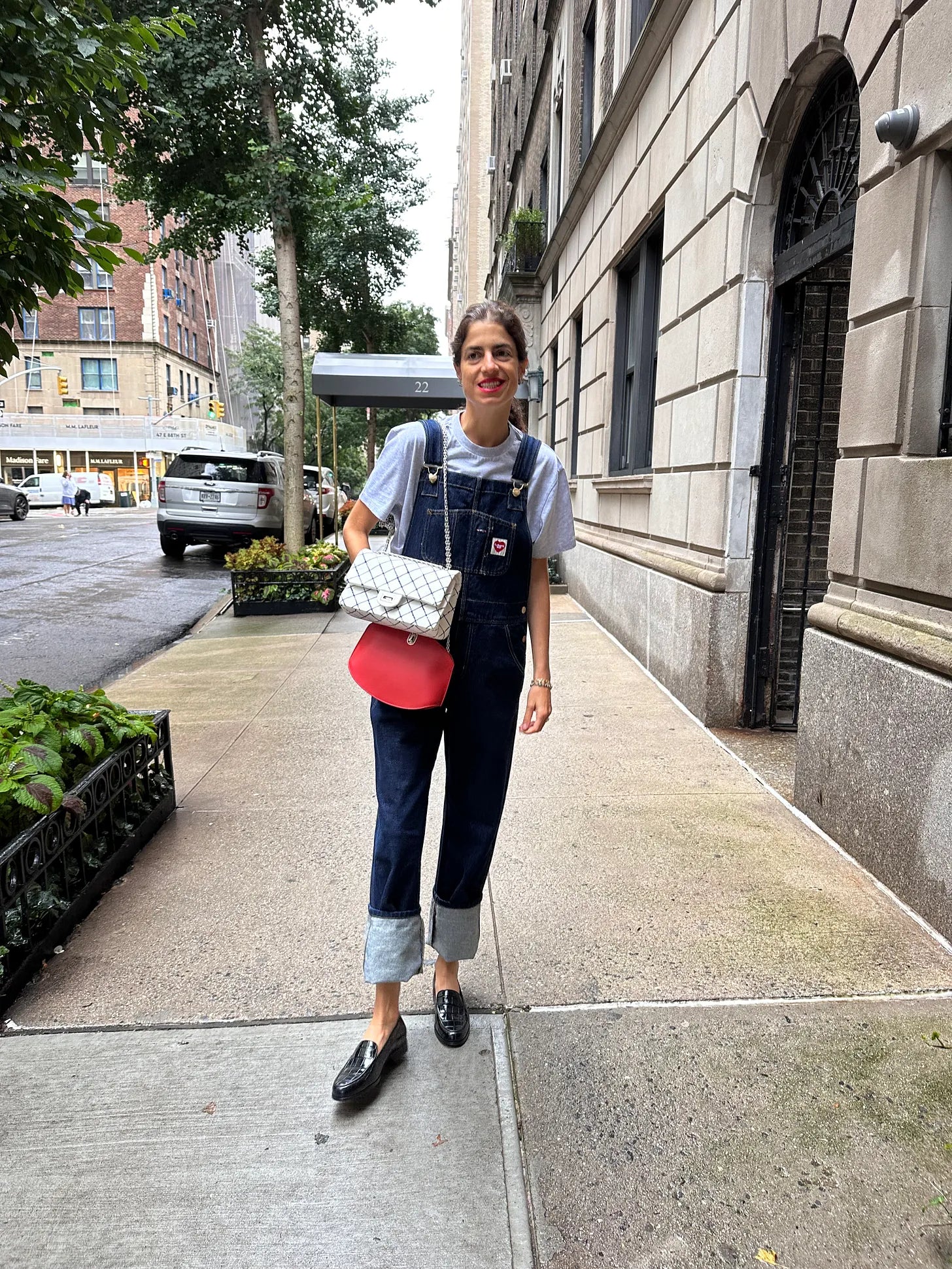 Wardrobe.nyc t-shirt, Carhartt overalls, Emme Parsons loafers, and a medley of handbags
