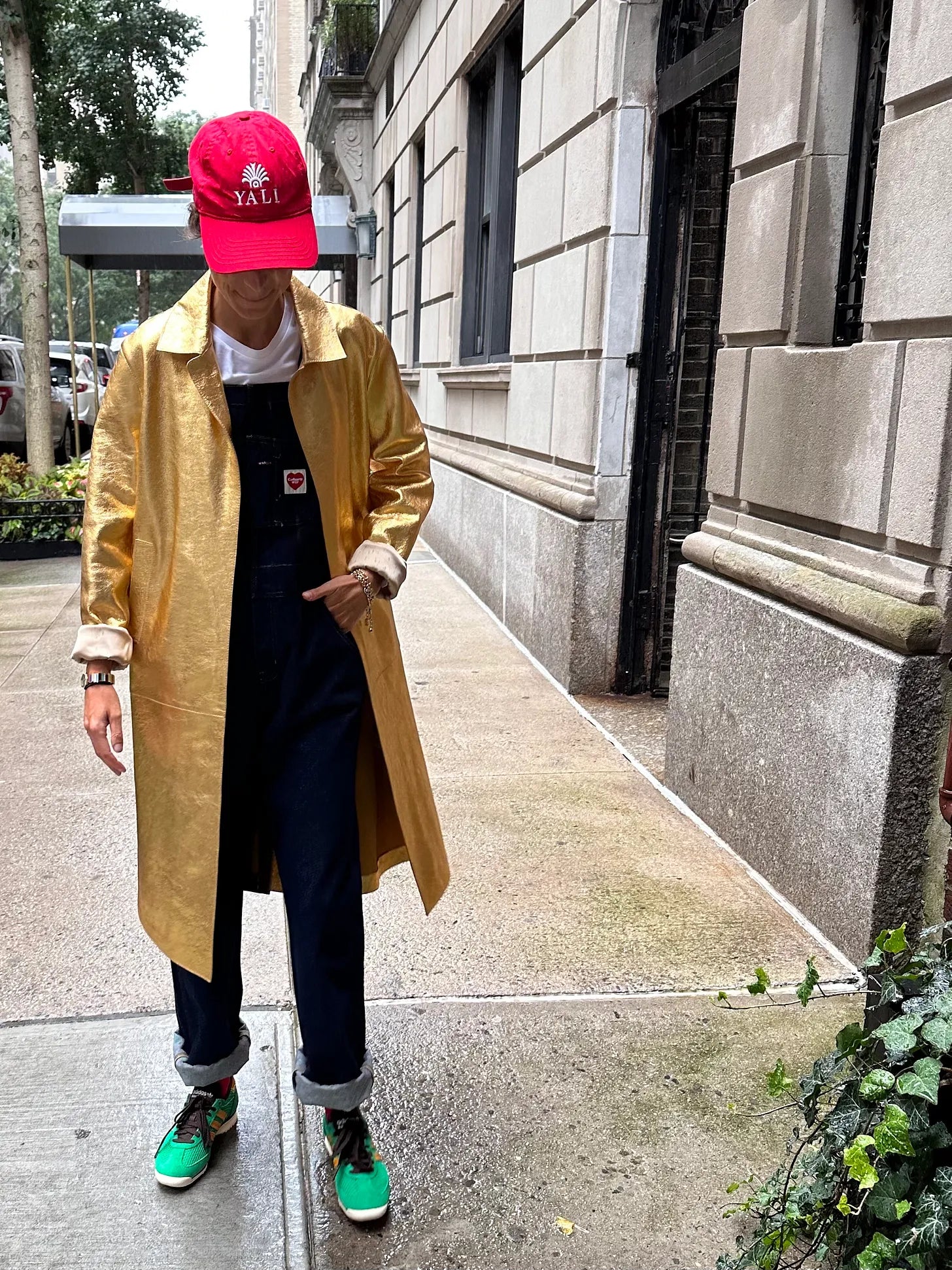 Here’s an errand runner that factors in dirty hair (baseball cap), comfortability (sneakers) and creative independence (gold coat). The trick of a STATEMENT PIECE like a gold leather coat is you want to wear it within contexts that make it feel like a given — so less like it’s a precious piece to wear only on special occasions when you want to stand out, more like the sun you bring with you when clouds are out and there is dry cleaning to retrieve, or whatever.