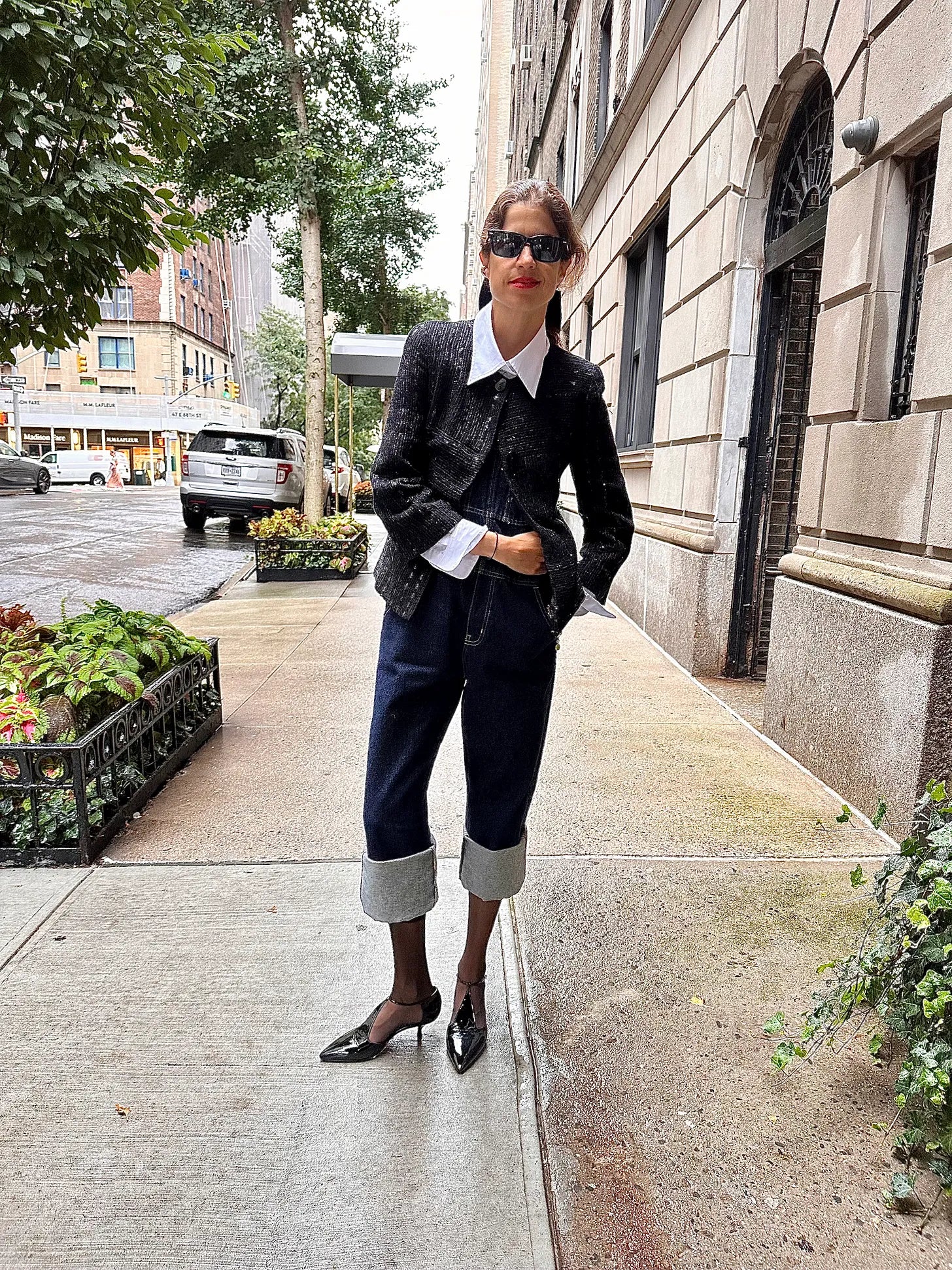 1990s Chanel jacket, an auspicious purchase I made when I was pregnant with Madeline and Laura in 2018 from TRR (this set is not exactly the same but it is vaguely similar); Soeur white button-down shirt (more crisp and refined than the classic LMND — and while we’re here, I found your ideal bridge pants too), Wolford knee high schools (Hue’s are a reliable and less expensive option too), Emme Parsons Leandra t-straps.