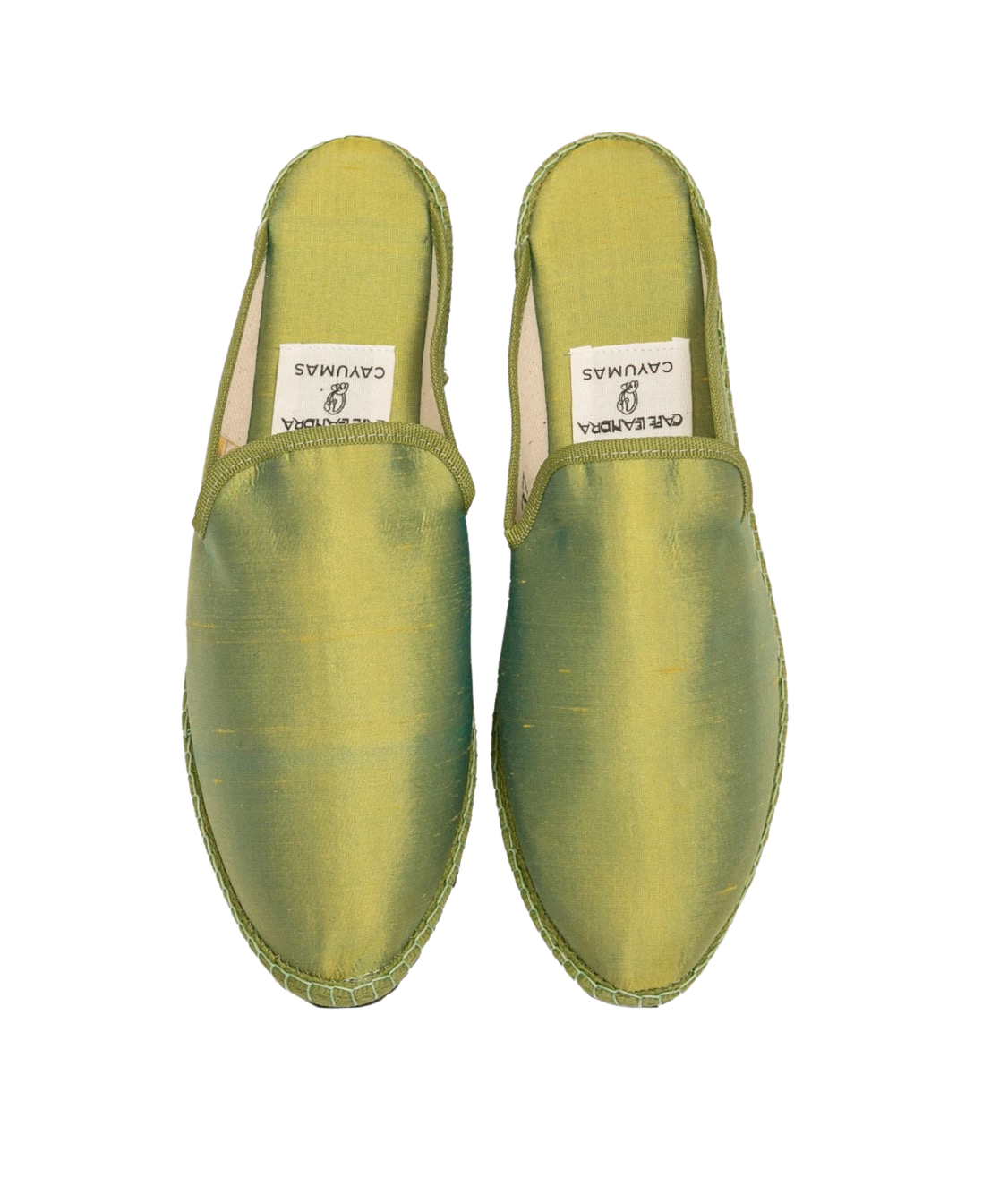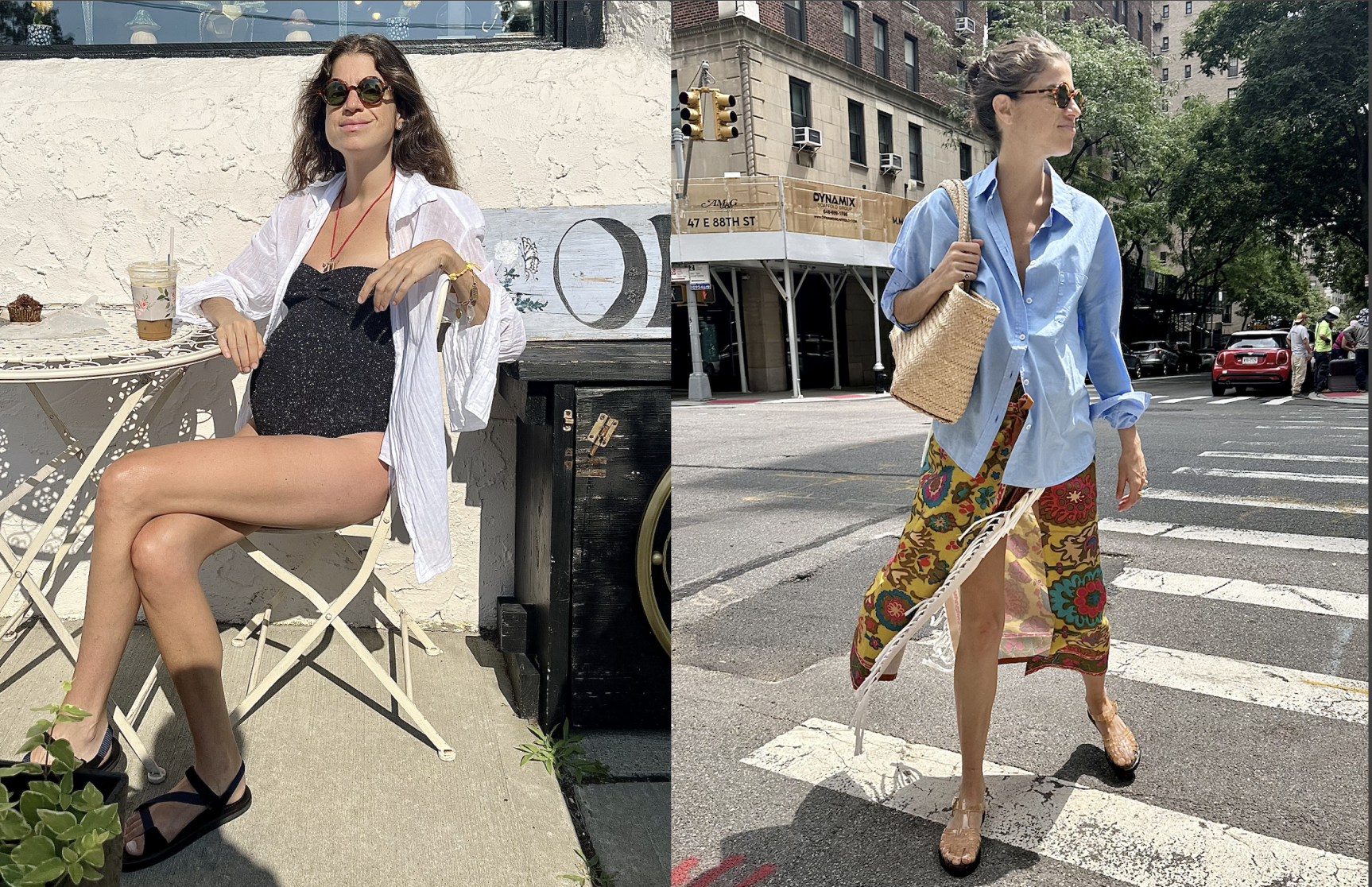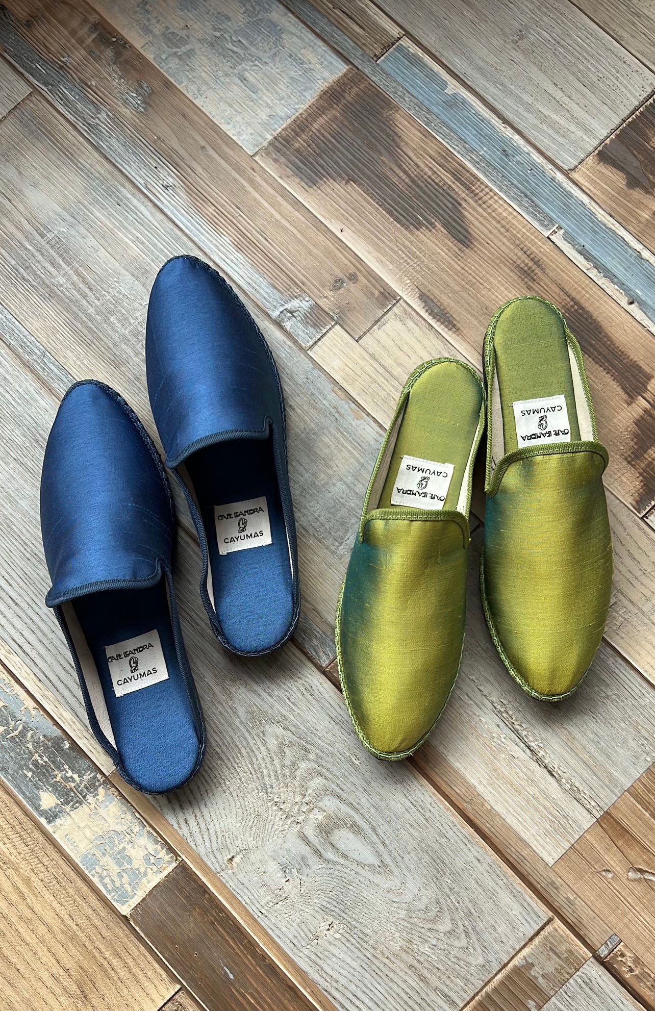 In the capsule you’ll find shades of charmeuse green and periwinkle blue silk on slides that cover the top half of the foot. These mesh perfectly with airy, nightgown style dresses. You will also find the classic Mary Janes in brown or light pink which I like best worn solo with a one-piece bathing suit and button-down shirt as a cover up.