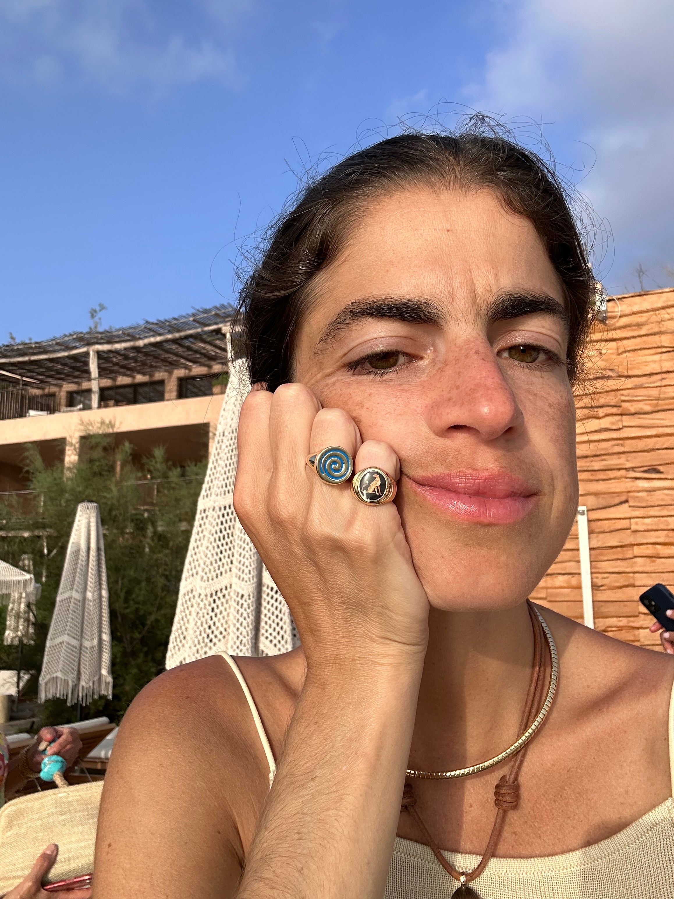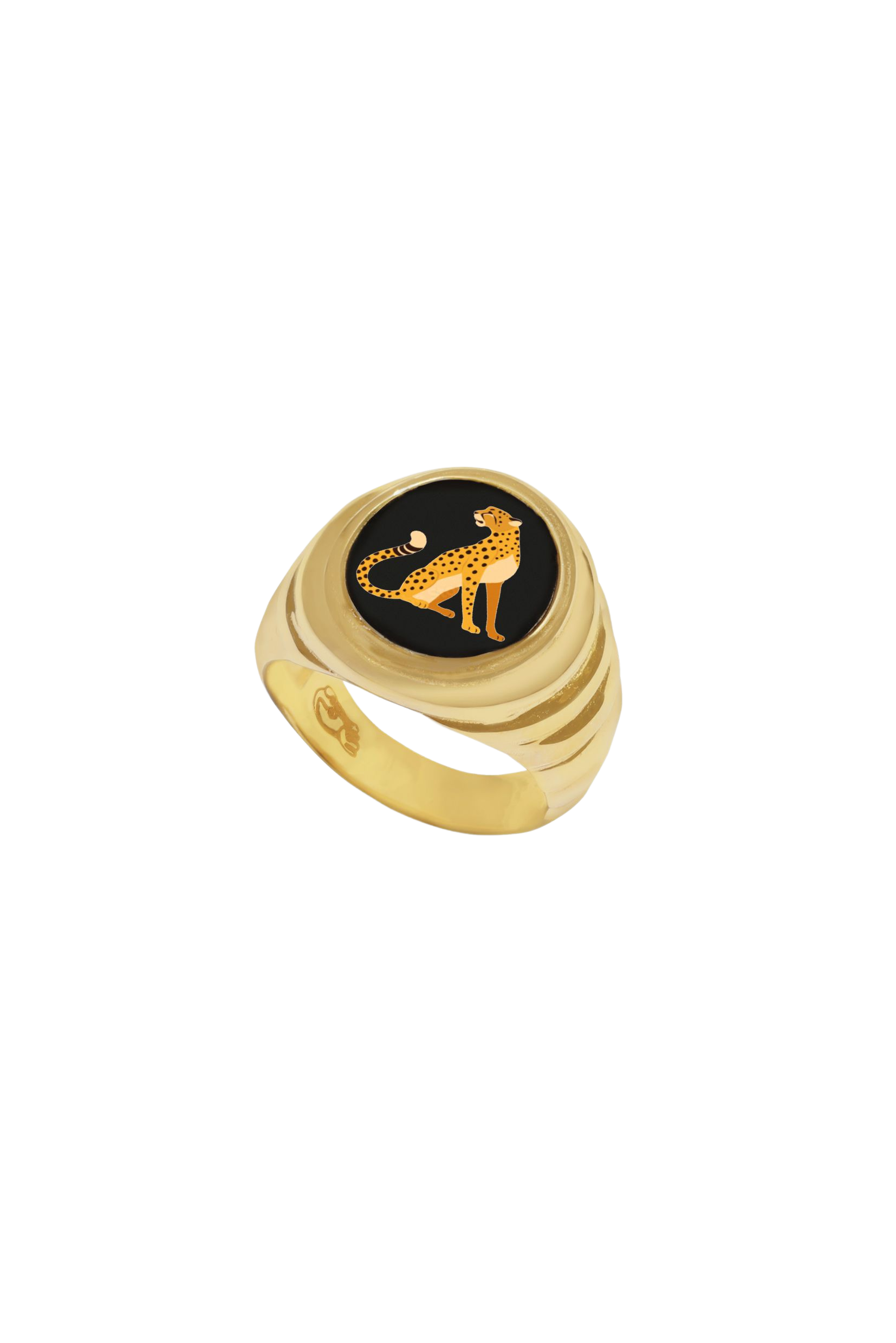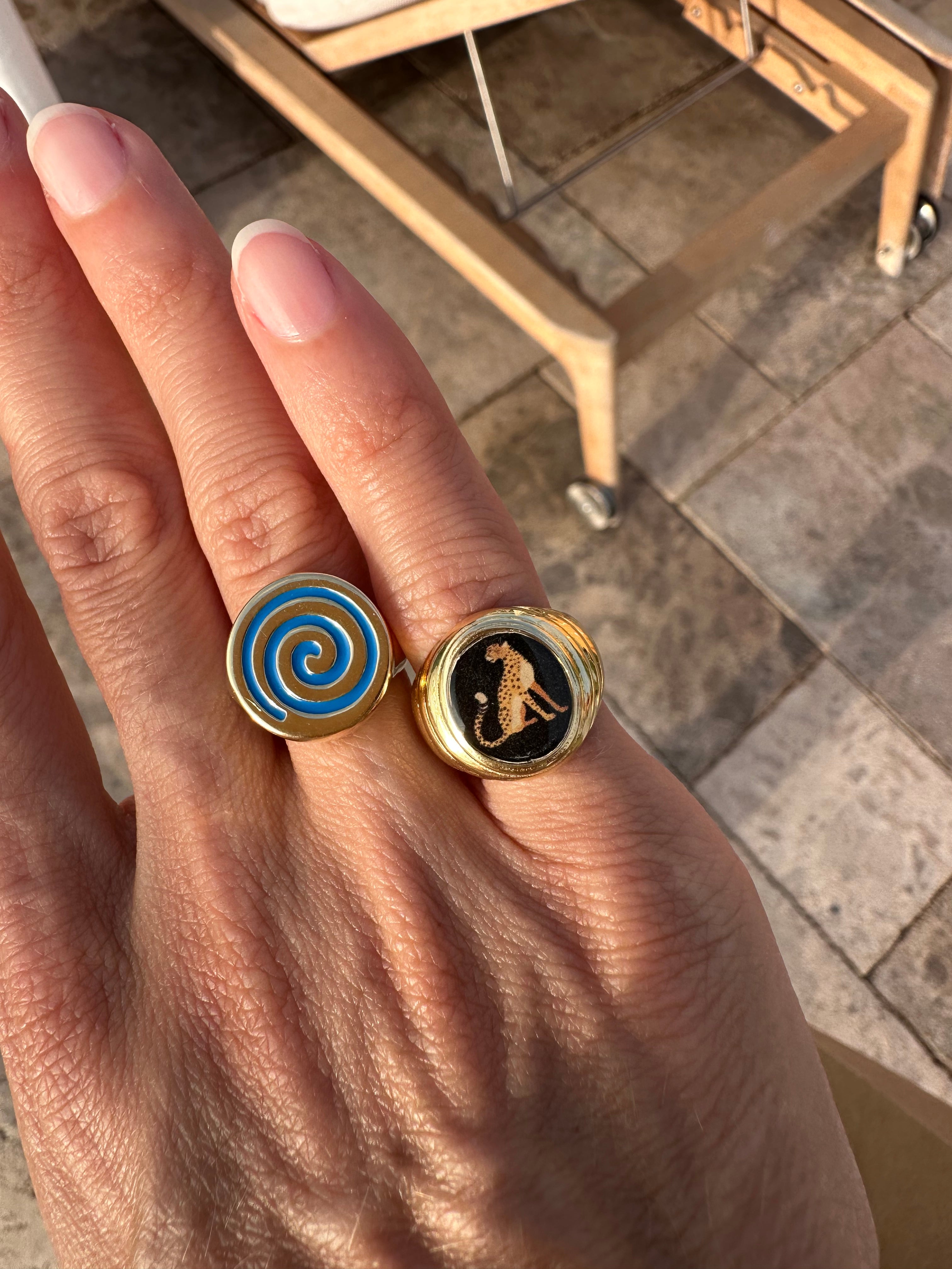 A range of two rings, one with a blue spiral and one with a cheetah. Both are silver plated in 18k gold with enamel work. The cheetah represents one’s fight to go after their thickest desires while the spiral reminds you that time is not linear, it travels within a loop.