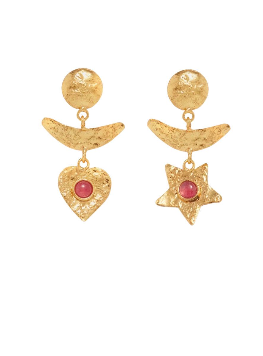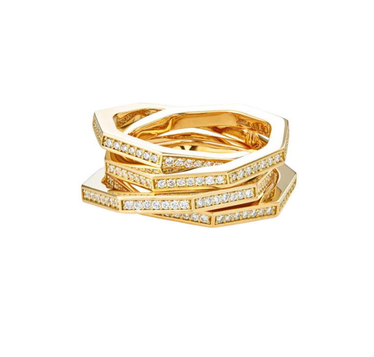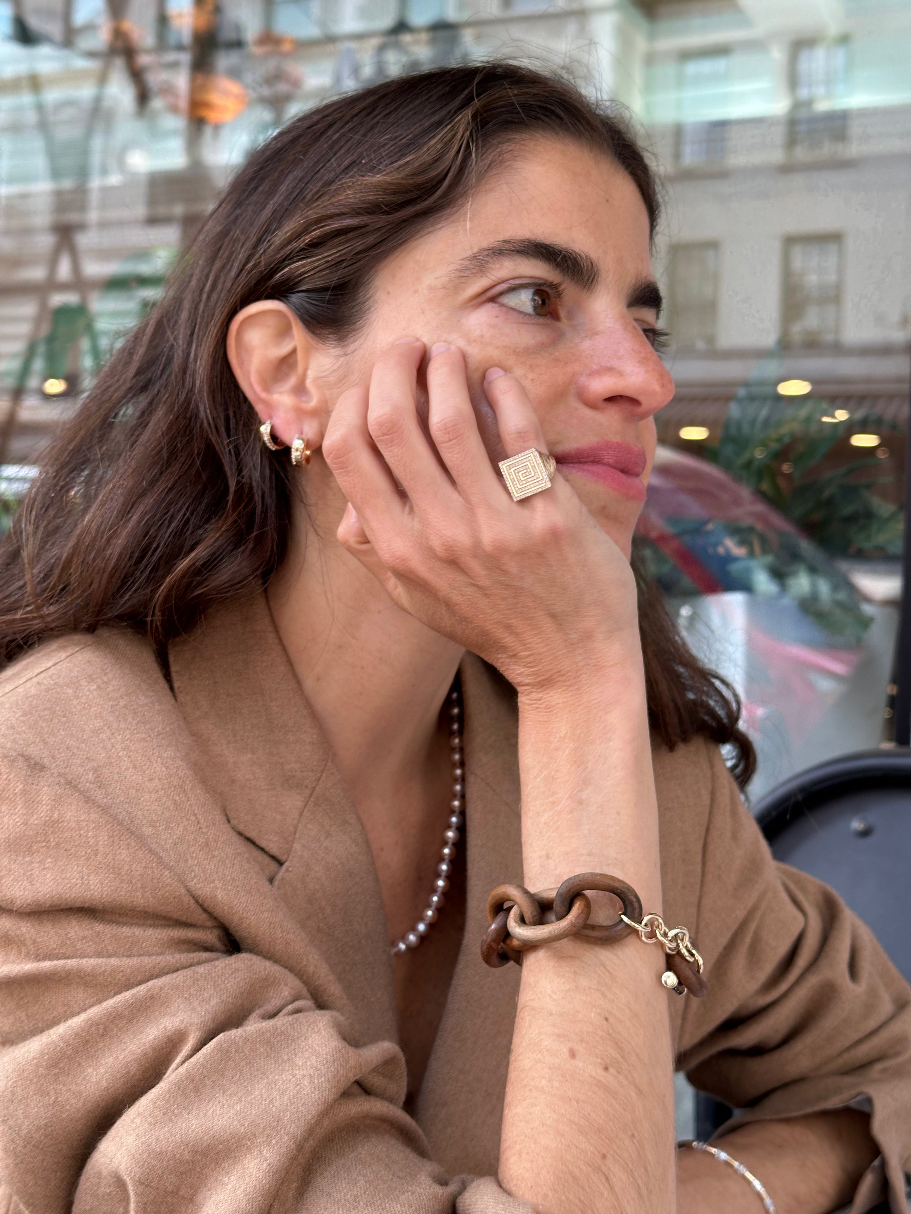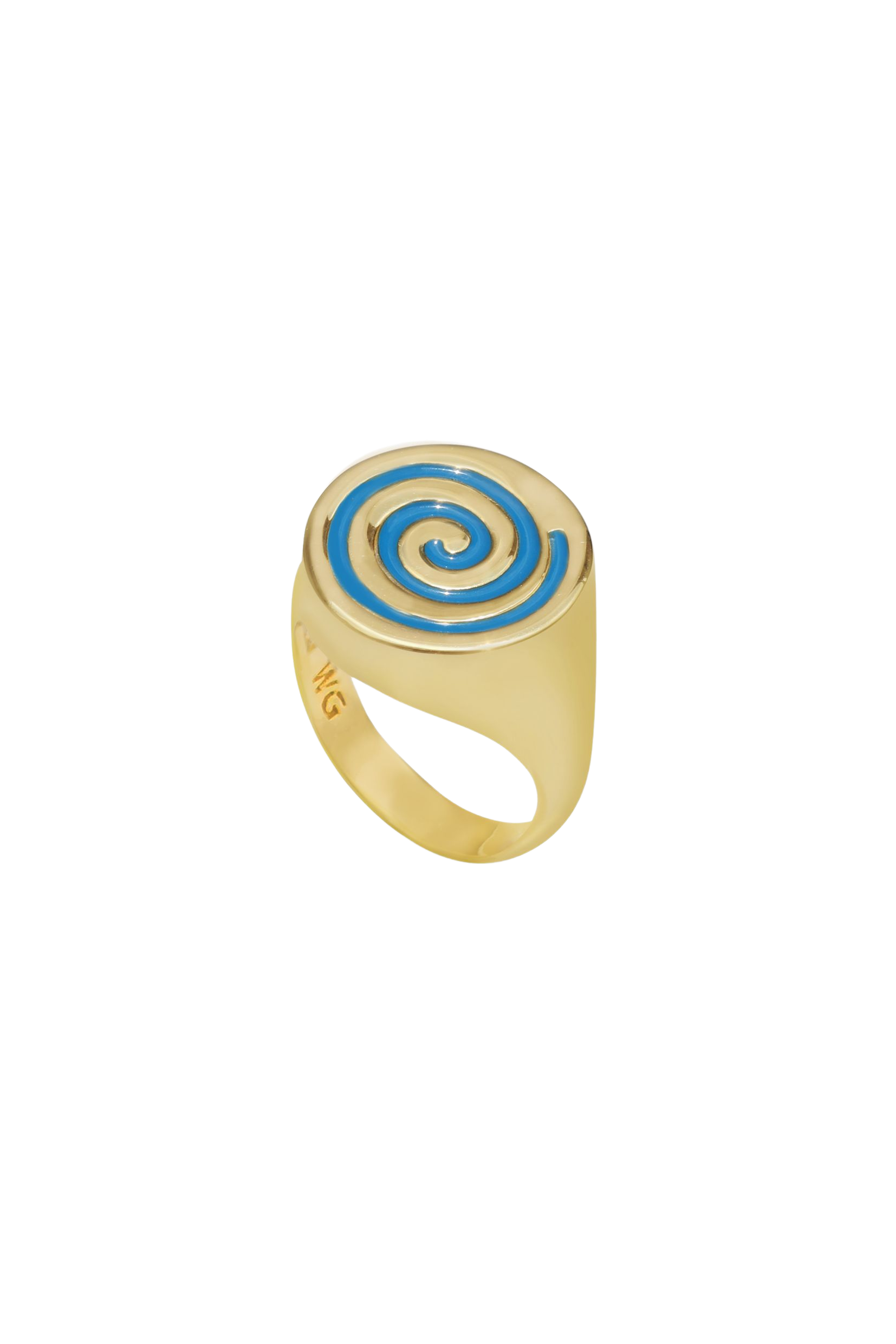 A range of two rings, one with a blue spiral and one with a cheetah. Both are silver plated in 18k gold with enamel work. The cheetah represents one’s fight to go after their thickest desires while the spiral reminds you that time is not linear, it travels within a loop.