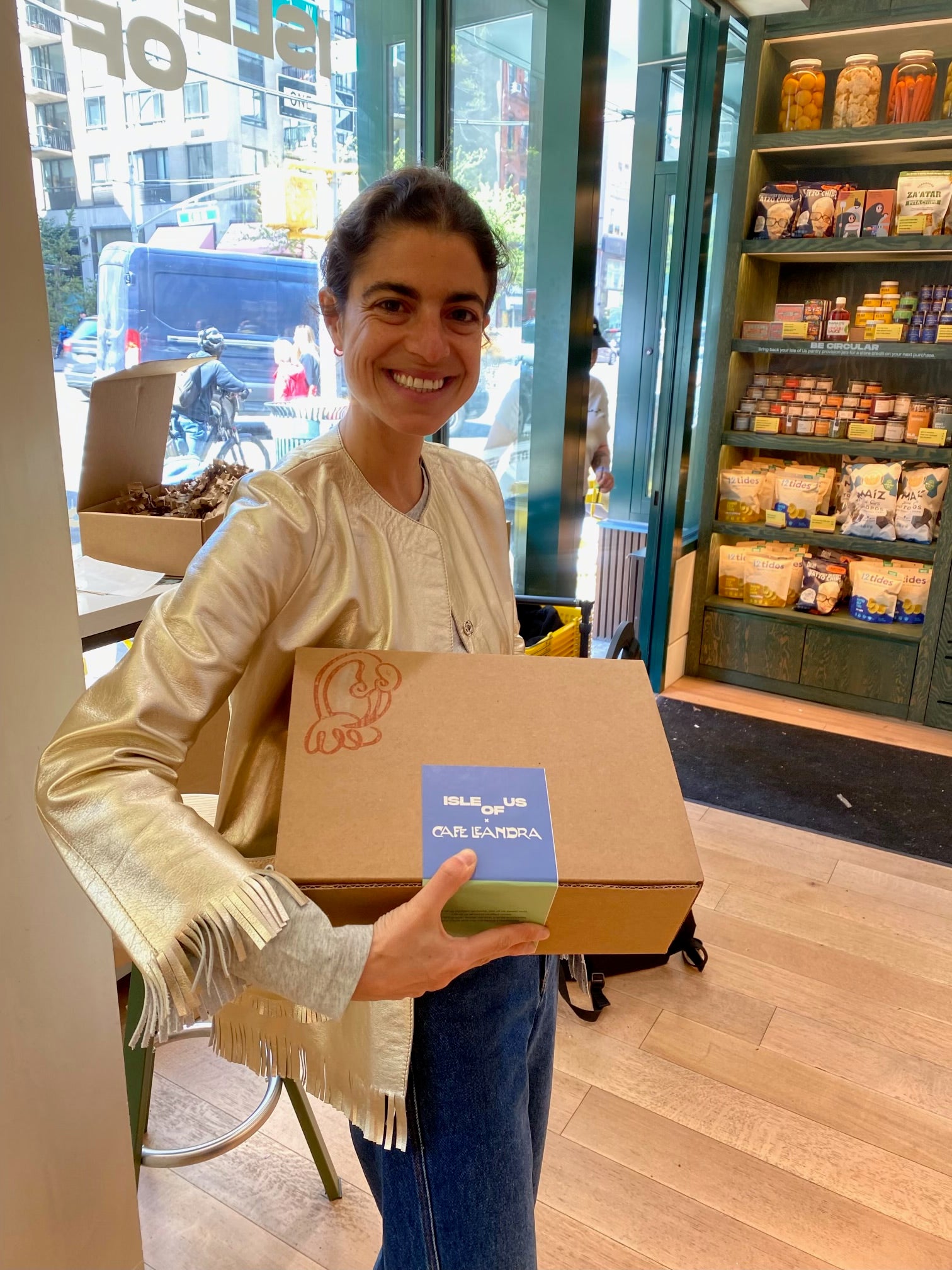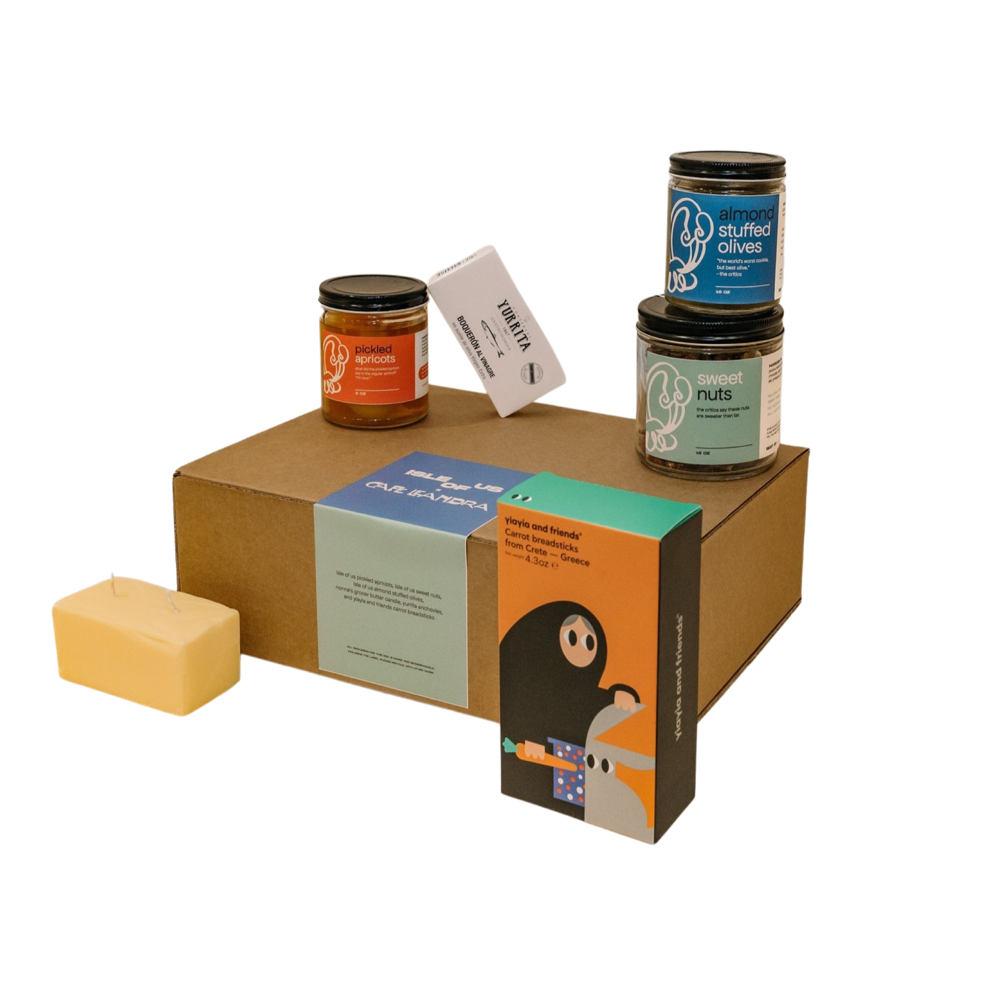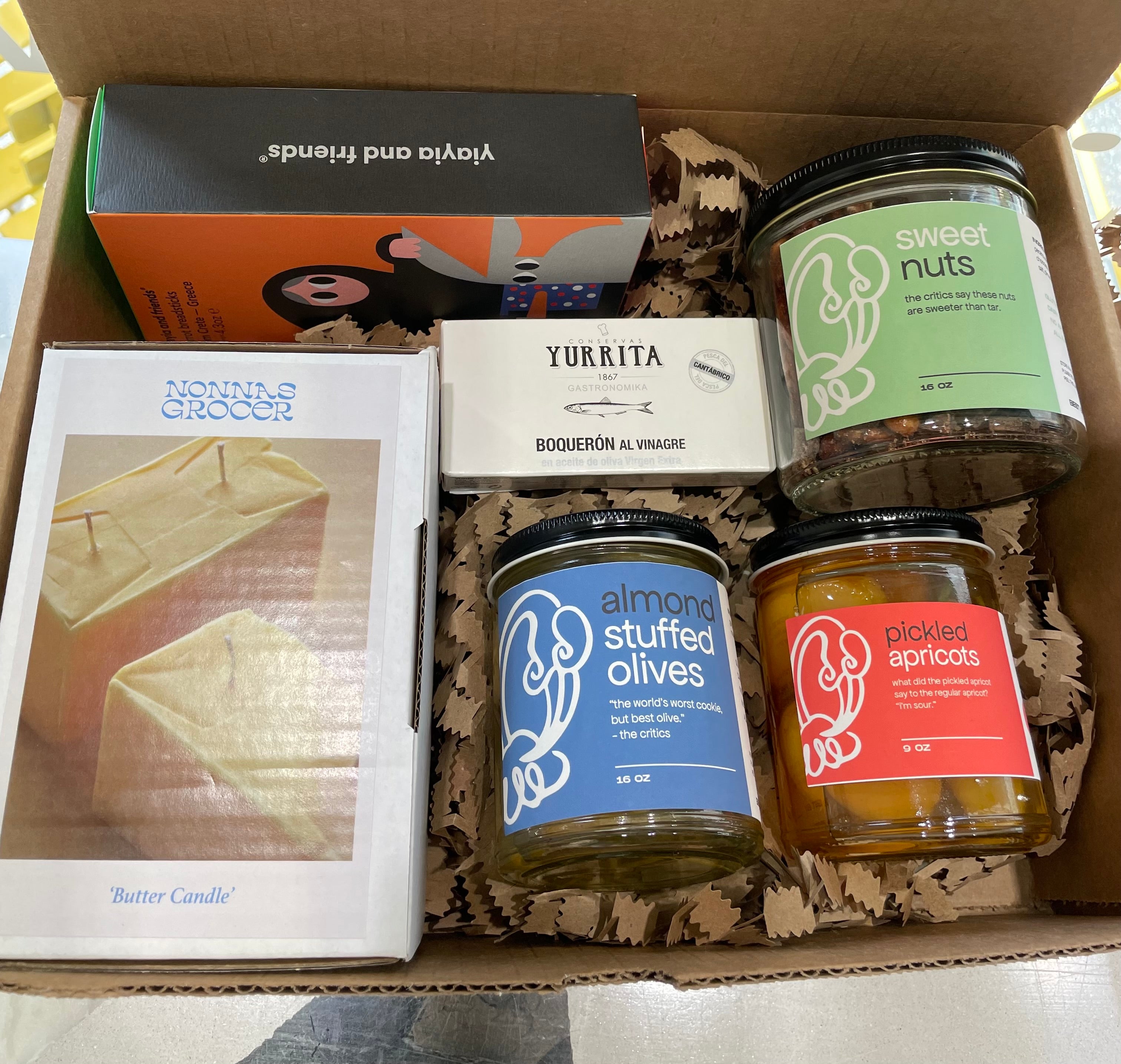 A cardboard box full of treats to commemorate spring in this “bougie picnic” assortment, concepted by me and made by Isle of Us.